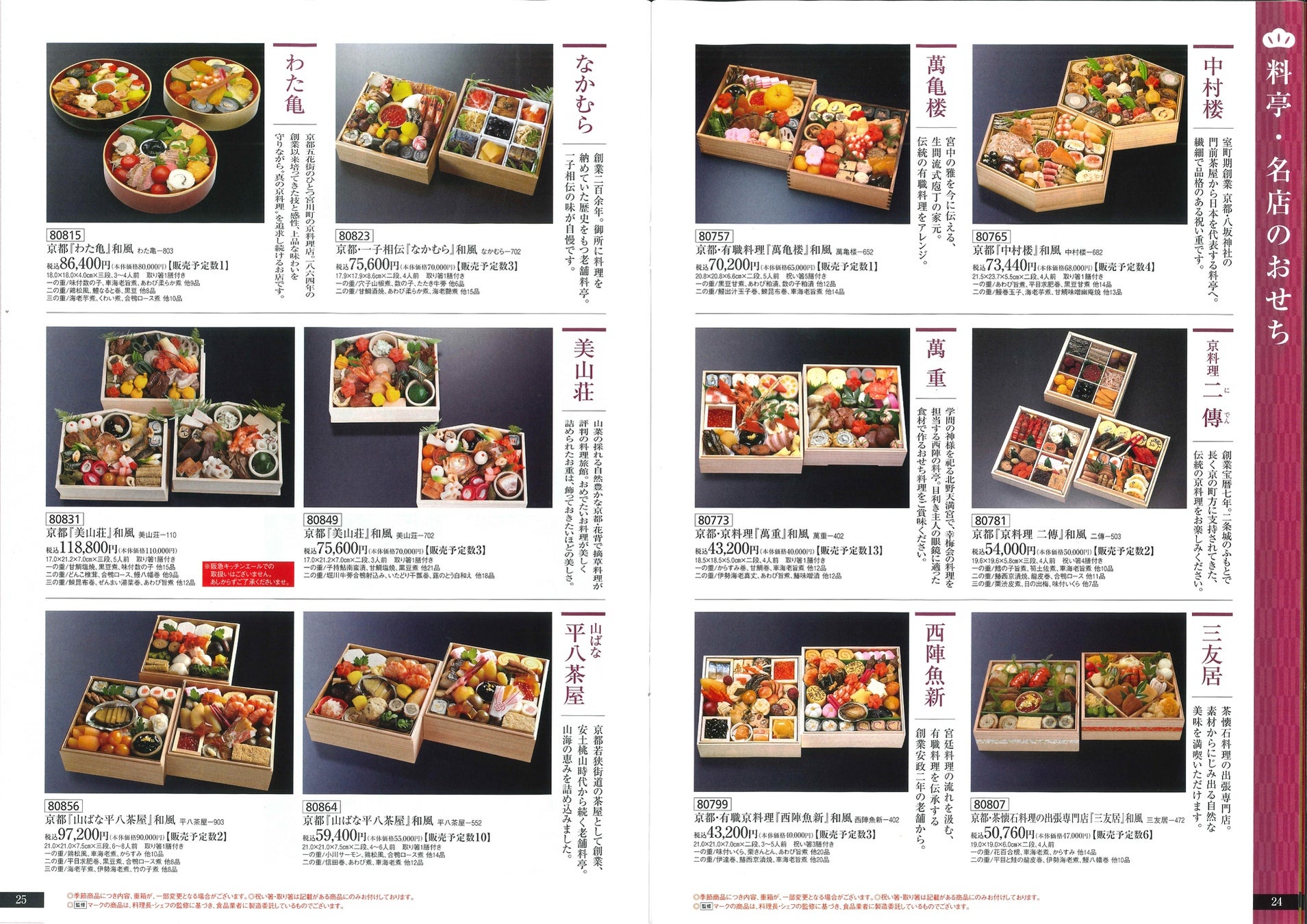 阪急百貨店とほぼ同等のランナップで商品をご紹介しています。百貨店ならではの京都の料亭・名店のおせち、デパ地下で人気のお店のおせち、人気シェフのおせちや有名ホテルやレストランのおせちなどなど、カタログ82ページ・300種類を超える豊富な種類からお選びいただけます。