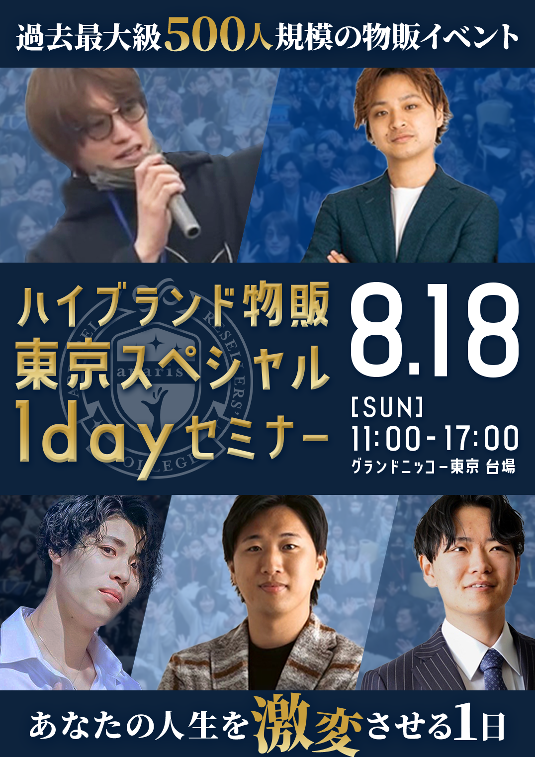 セミナーには、20歳という若さで月利260万円を突破したタクト講師をはじめ、ハイブランド物販に特化したショウ講師、安定した信頼と実績を誇るTA&ダイワ講師、そしてスキルのみならずマインド面にも焦点を当てたトウマ講師など、豪華な講師陣が登壇しました。