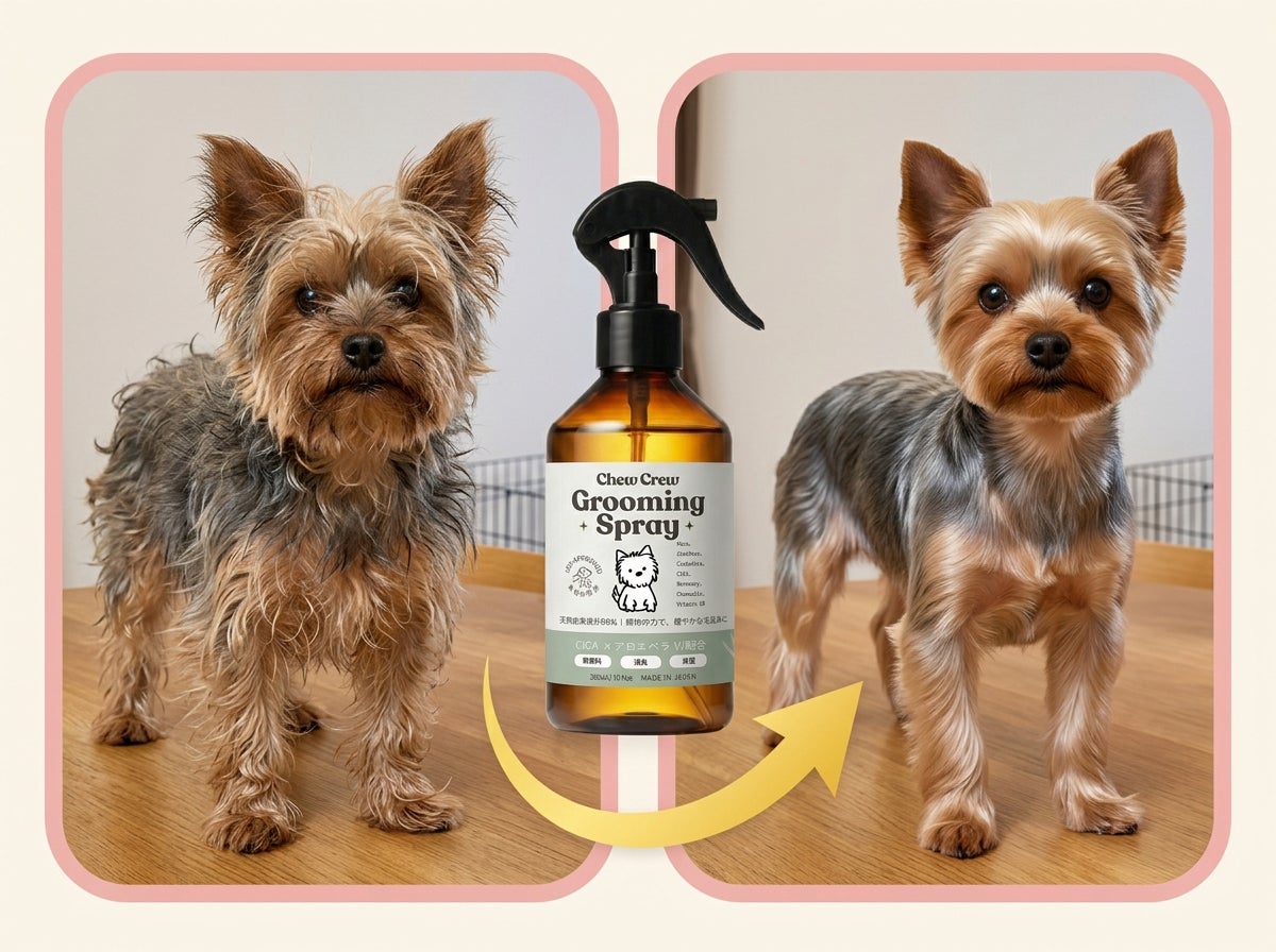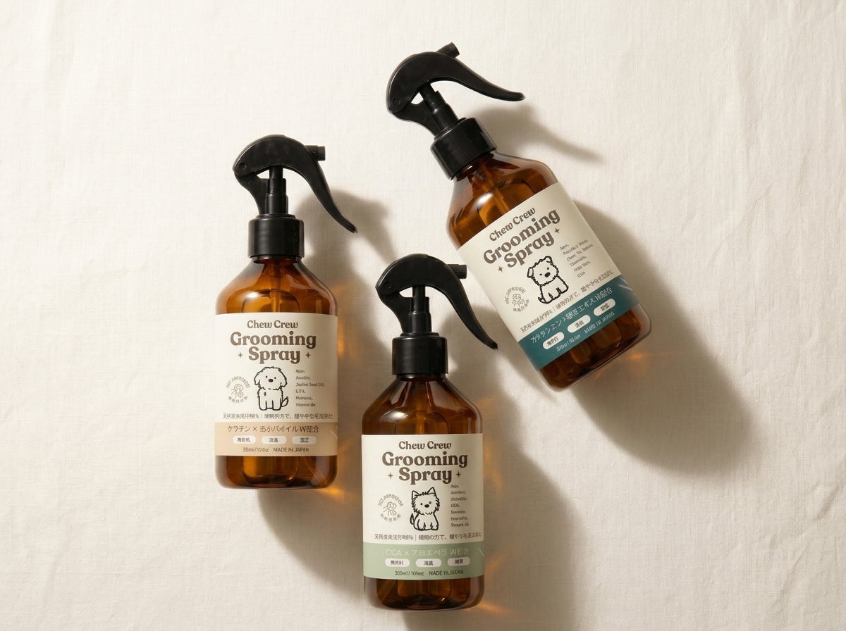 Extra Basic 株式会社(以下「当社」)は、愛犬の被毛・皮膚ケアを自宅でサロンクオリティに仕上げる次世代グルーミングスプレー「Chew Crew Grooming Spray」シリーズより、「Shine(シャイン)」「Calm(カーム)」を2025年4月1日(火)よりAmazonにて発売することをお知らせします。また、第3弾「Refresh(リフレッシュ)」は4月中旬の発売を予定しています。