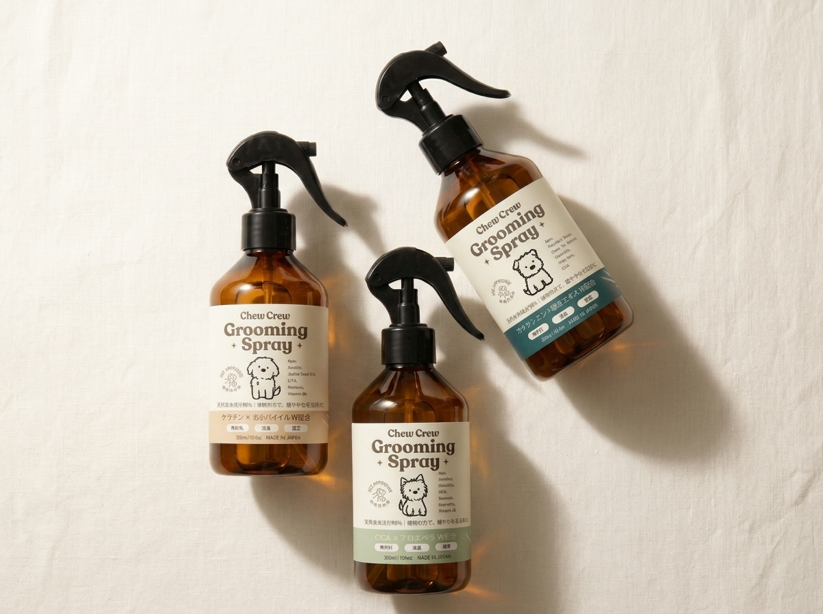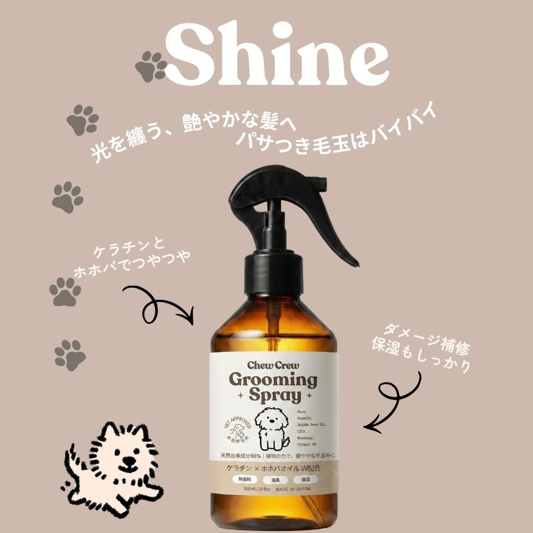 CHEW CREW、愛犬の被毛と皮膚に“美容液レベルの処方”を届けるグルーミングスプレー「Shine」「Calm」を4月1日より発売