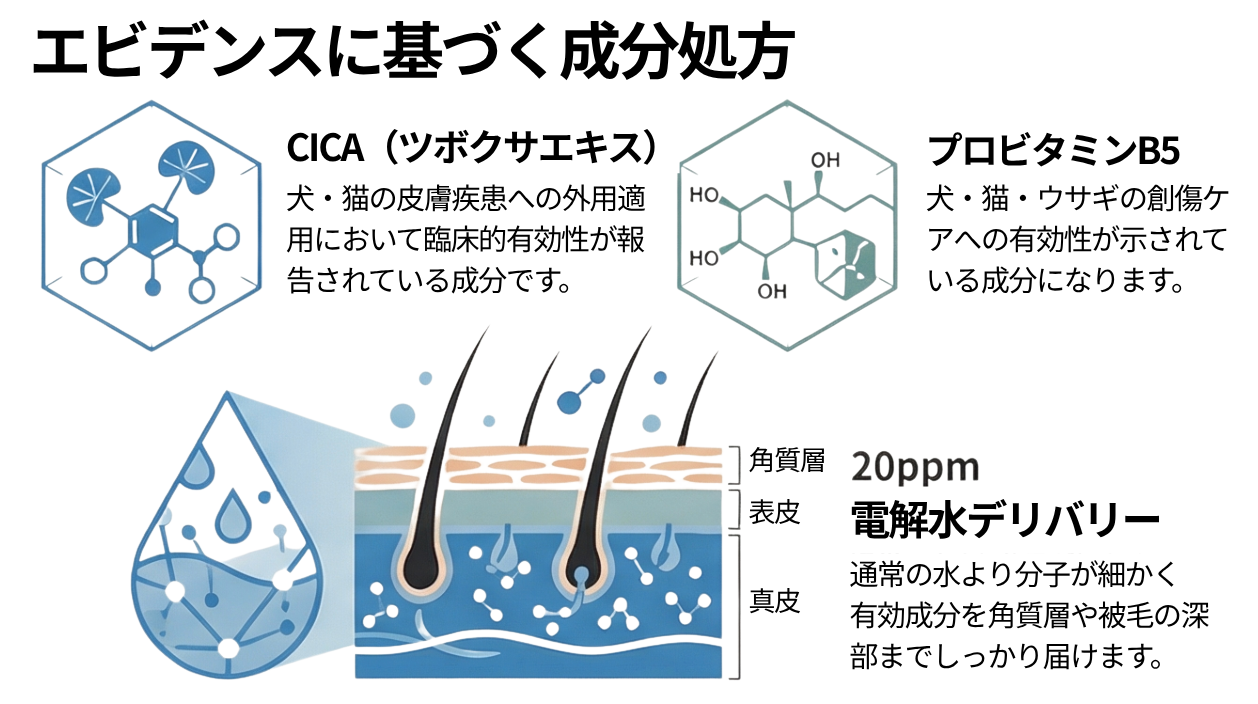 本シリーズは「香り付け」や「一時的なツヤ出し」にとどまる従来品とは一線を画し、犬・猫の皮膚疾患への外用適用において臨床的有効性が報告されているセンテラアジアチカ(CICA)(※4)、犬・猫・ウサギの創傷ケアへの有効性が示されているデクスパンテノール(プロビタミンB5)(※5)、そして動物の皮脂と化学的に近い構造を持ち獣医師にも推奨されるホホバオイルを共通処方として採用。動物の皮膚・被毛研究の知見に基づき、皮膚の奥からバリア機能と被毛の健康にアプローチする処方を実現しました。