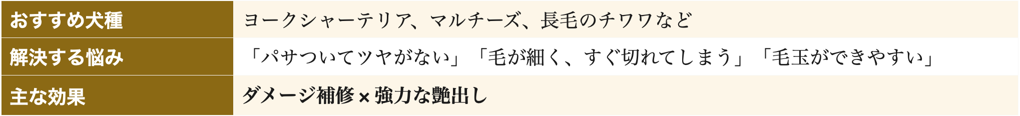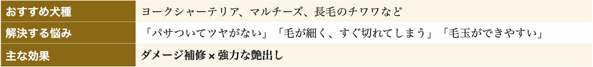 被毛の約80%を構成するタンパク質「ケラチン」を加水分解し、傷んだ毛髪の内部から補修。ホホバオイルは皮脂に近い「ワックスエステル」を含む植物オイルで、被毛にベタつく油膜を張ることなく、軽い質感で自然な光沢と滑らかな指通りを与えます。