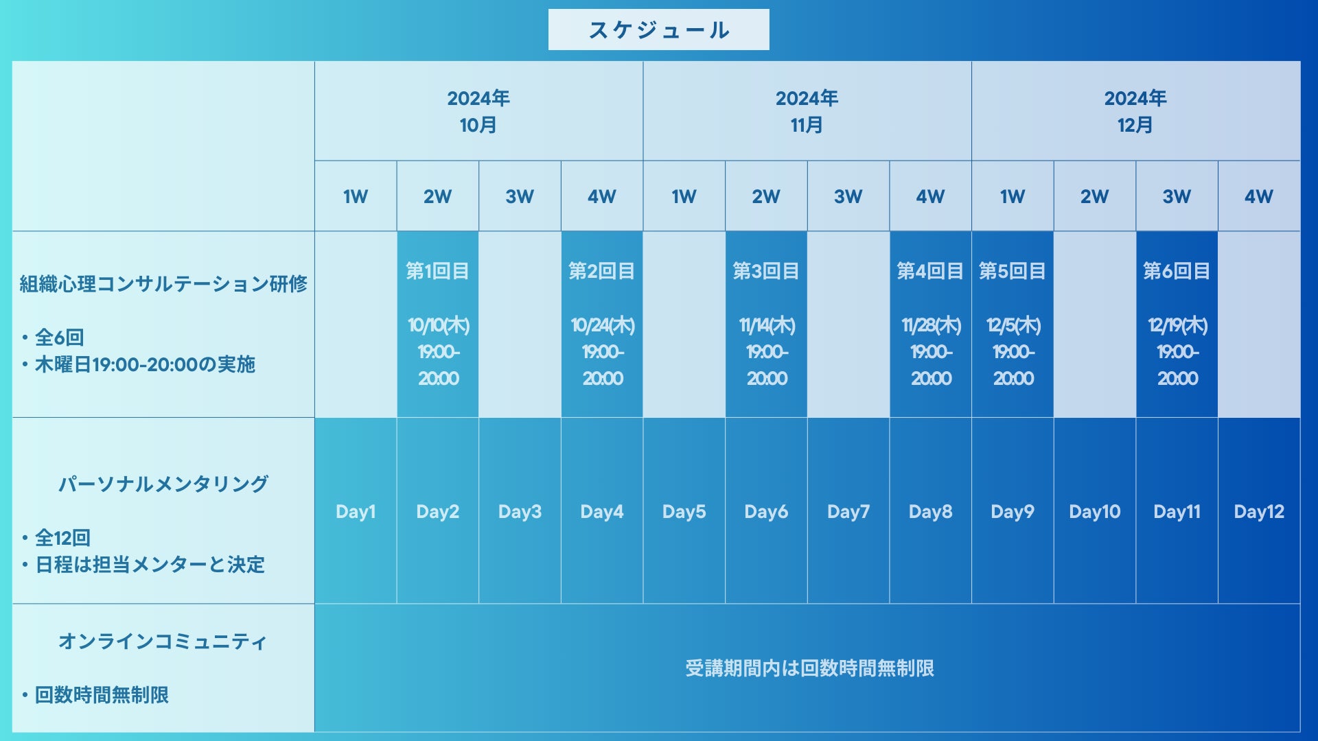 パーソナルメンタリングの実施日程については受講生のご希望をお伺いし、メンターと日程調整の上、最終的に決定いたします。