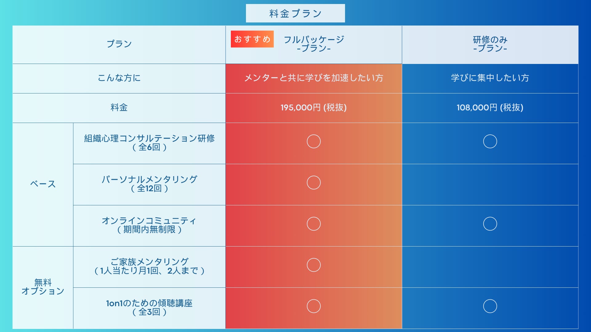 3ヶ月の本プログラム受講にかかる費用は、フルパッケージプランで195,000円(税別)になります。その他、研修のみの108,000円(税別)のプランもご用意しております。詳しくは上記「料金プラン」をご参照ください。