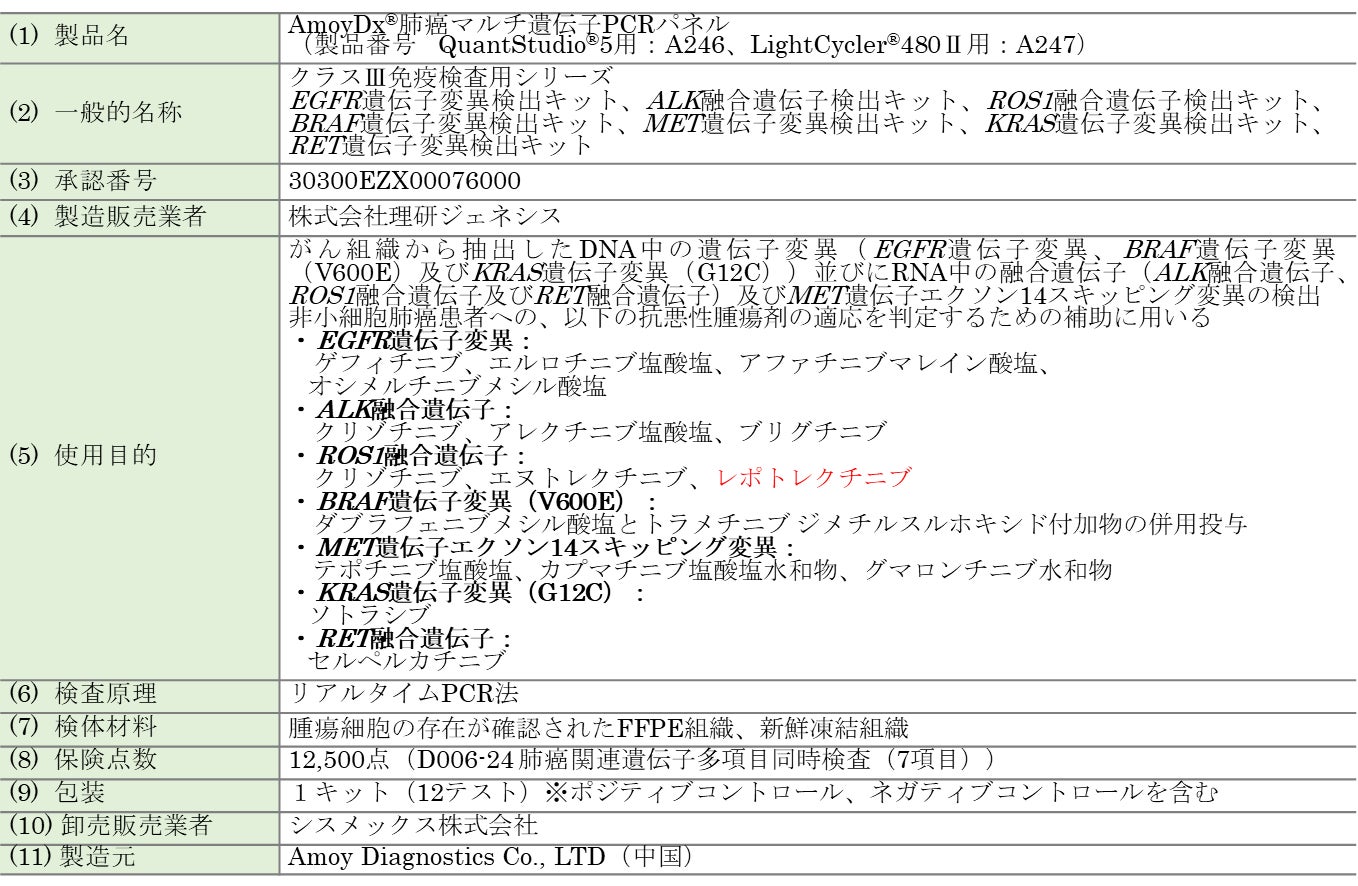 株式会社理研ジェネシス(本社:東京都品川区、代表取締役社長:岩壁 賢治、以下、「理研ジェネシス」)は、2024年9月19日付で、複数の抗悪性腫瘍剤に対するコンパニオン診断薬※1として体外診断用医薬品「AmoyDx®肺癌マルチ遺伝子PCRパネル(以下、「本製品」)」の製造販売承認事項一部変更承認(以下、「一部変更承認」)を取得したことをお知らせします。