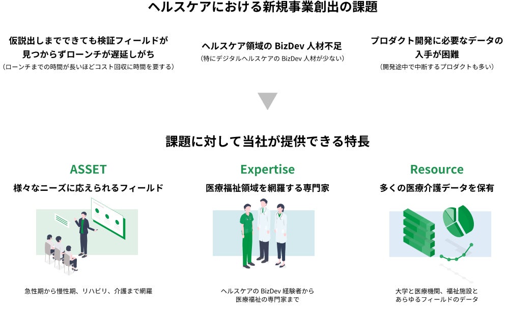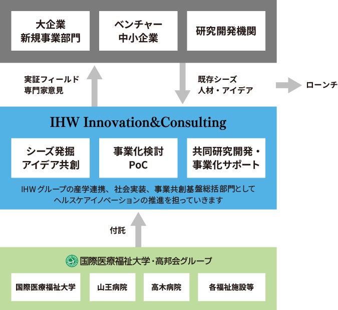 IHWグループは医学部をはじめとする医療福祉の総合大学「国際医療福祉大学」などの教育施設と、“お産の山王”で有名な「山王病院」や、「国際医療福祉大学三田病院」をはじめとする医療施設、介護施設を全国約70ヶ所で運営しており、急性期から回復期、慢性期、介護、福祉領域とあらゆる領域を網羅する特長を生かした様々なニーズに応えられる実証フィールドの提供が可能となります。また、医学部だけでなく医療福祉領域のあらゆるスペシャリストを育成する教育施設である特長を生かし、医師をはじめ理学療法士や作業療法士、看護師、介護福祉士など多職種の領域エキスパートが新規事業の共創支援に携わることが可能です。