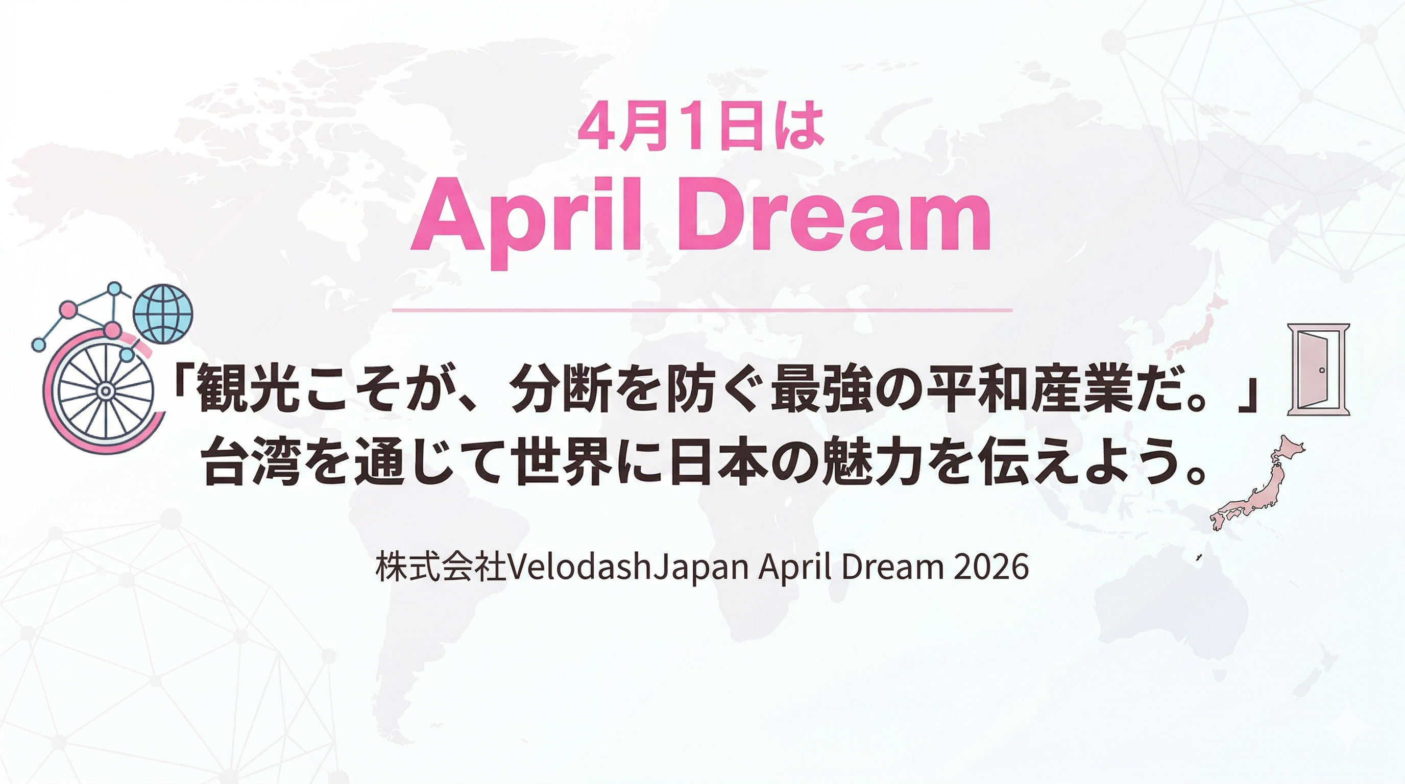 観光は単なるレジャーではなく、相互理解を深め、互いの文化を尊重し合うための「平和産業」です。私たち株式会社VelodashJapanの夢は、この平和産業をプロモーションや事業支援で価値を最大化し、日本と台湾、そして世界が手を取り合う平和な社会を実現することです。