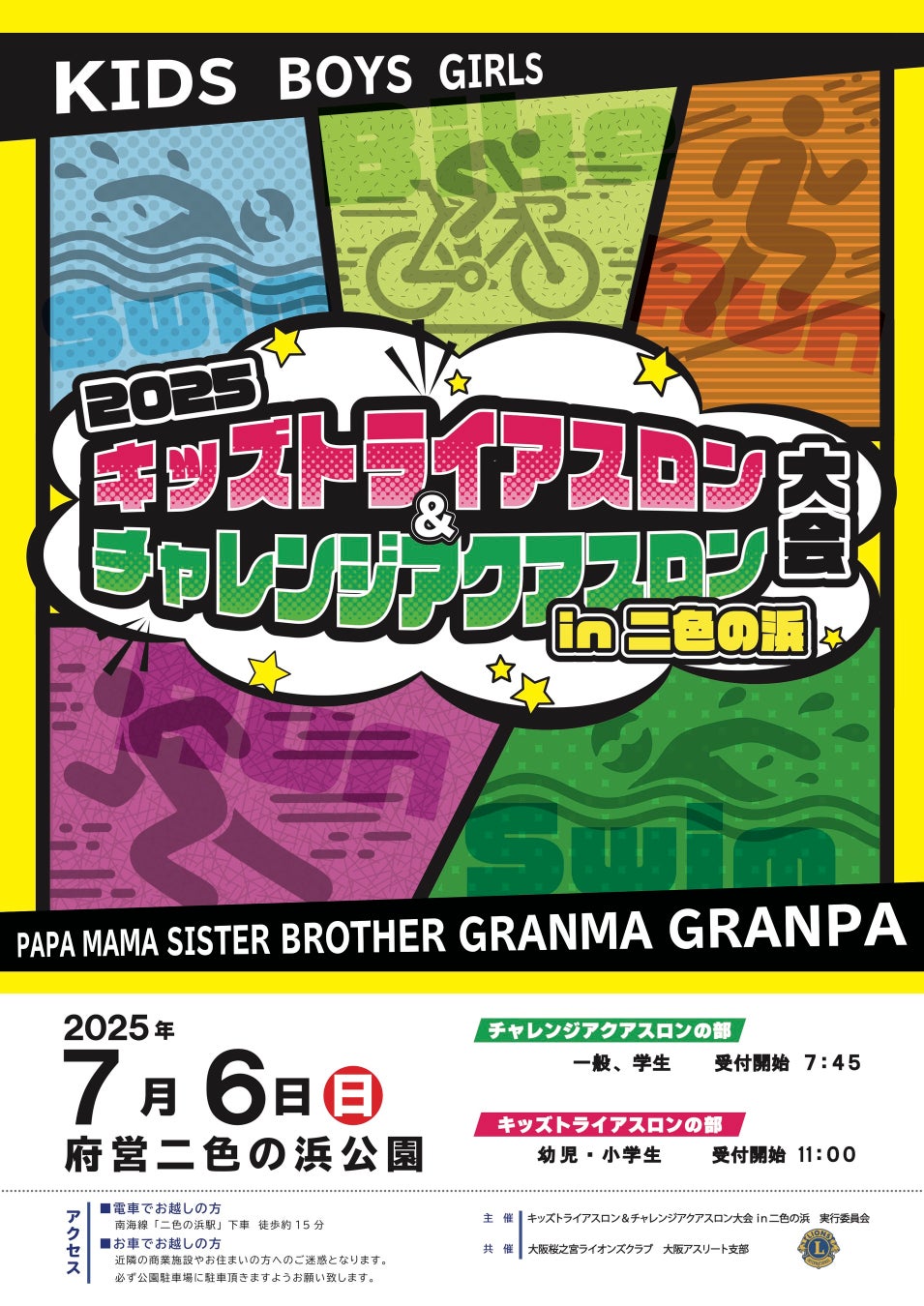 RETRIN株式会社(大阪府大阪市、代表取締役 宮本恒平)は、二色の浜トライアスロン実行委員会および大阪桜之宮ライオンズクラブ大阪アスリート支部が主催し、大阪府トライアスロン協会が競技主幹を務める『キッズトライアスロン&アクアスロン in 二色浜』を、2025年7月6日(日)7:00~16:00に二色浜公園内芝生広場(大阪府貝塚市二色浜町)にて開催いたします。本大会は、RETRIN株式会社、大阪府ライフセービングクラブ、医療法人徳洲会岸和田徳洲会病院、社会医療法人清恵会 清恵会病院の協力を得て実施します。