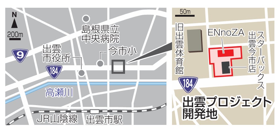 山陰中央新報社が社会課題の「人口減少社会」に向き合うために、新たに取り組む開発事業です。建設地は出雲市中心市街地の旧国道9号沿いで、周辺には教育施設や高層住宅が集まり、近年IT企業の立地も進んでいます。第1期としてスターバックスが昨年9月にオープンし、多くの方々にご利用いただいています。 第2期としてENnoZAがこのたびオープンします。