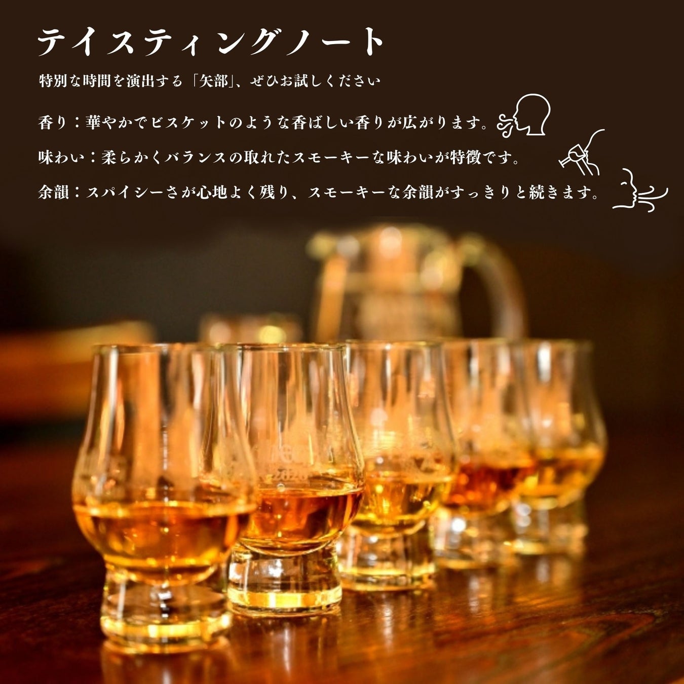 FINISH(余韻): スパイシーさが心地よく残り、スモーキーな余韻がすっきりと続きます。