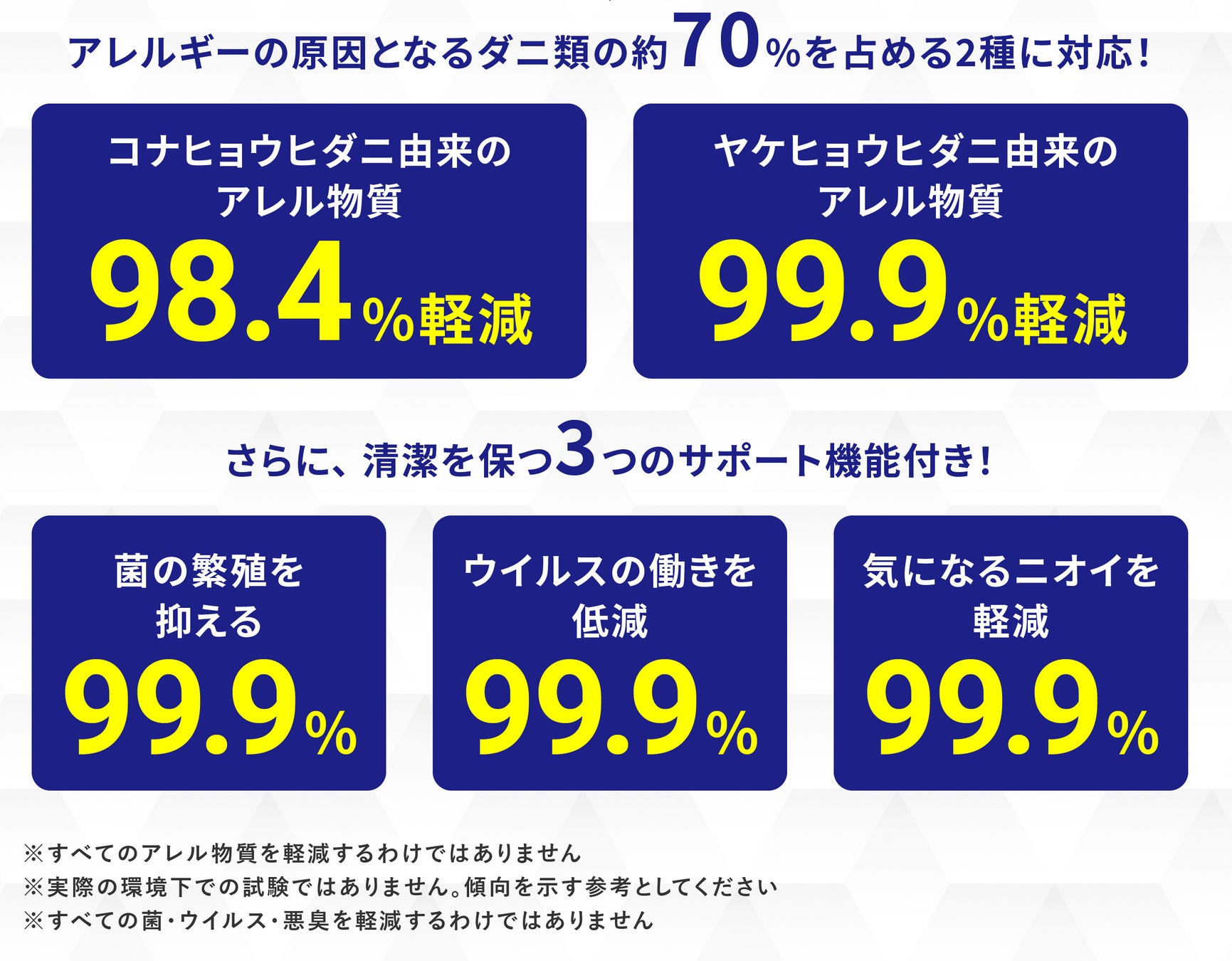 ※1ダニ(生体)を殺虫・捕獲・忌避する製品ではありません。※2すべてのアレル物質・菌・ウイルス・悪臭を除去するわけではありません。効果は使用環境により異なります。