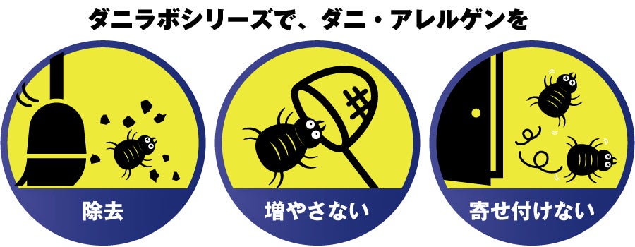 今回の『ダニダストラボ』をラインアップすることで、「捕獲」「忌避」「空間に舞い上がったアレル物質の除去」に加え、「布製品に残存するアレル物質の除去」の対策までカバーでき、室内における総合的なダニ対策ができるようになります(詳しくはそれぞれの商品詳細をご覧ください)。
