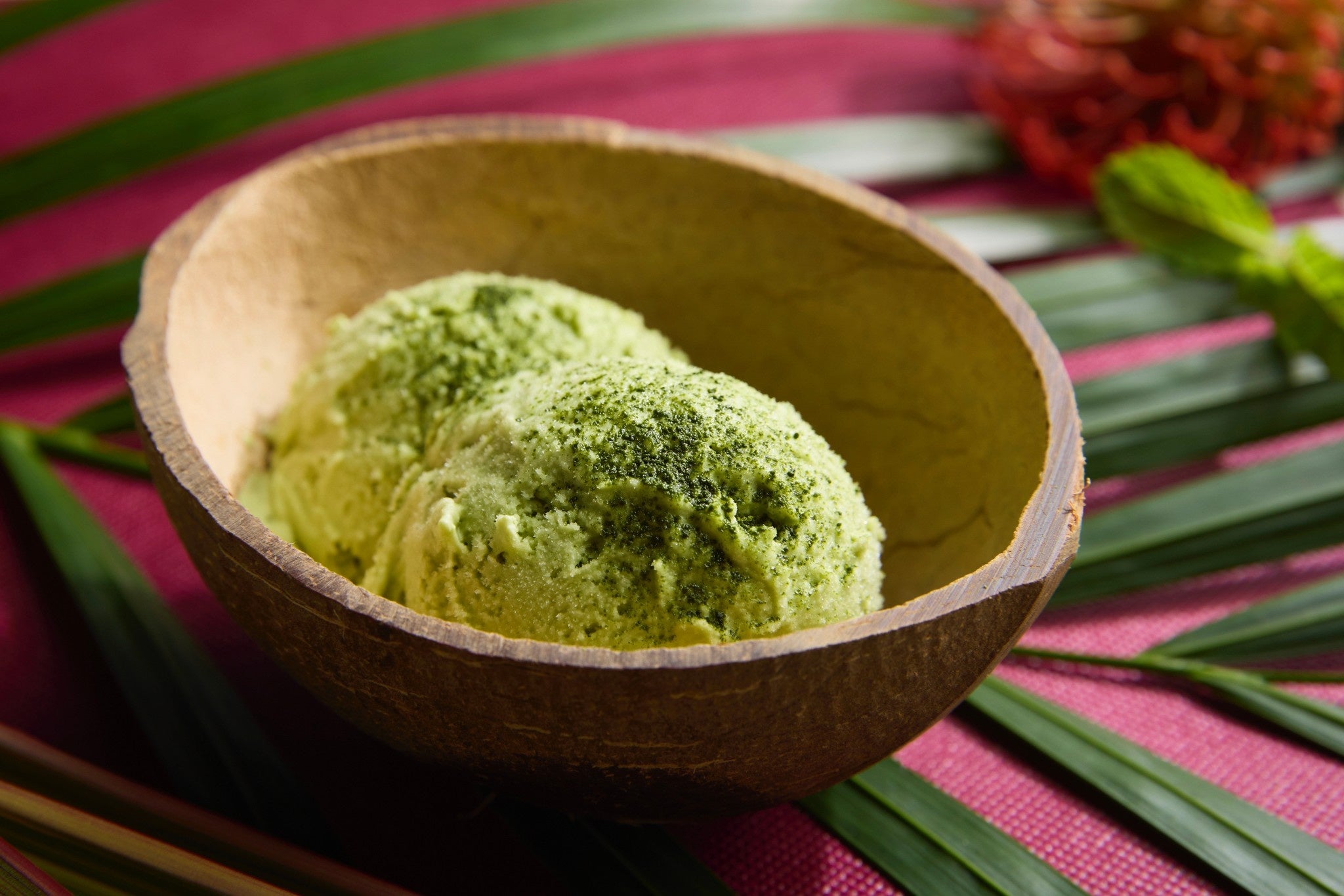 「Coco Matcha」は、オーガニックのココナッツミルクをベースに、旬を迎えた香り高い抹茶をブレンド。隠し味にミントを加えました。口に入れた瞬間に抹茶の香りと甘みが広がり、後味にミントの清涼感のある香りがほのかに鼻を通ります。爽やかに楽しめて後を引く味わいは、他では出会えない、「ココナッツグレン」ならではの遊び心とオリジナリティ溢れる美味しさです。