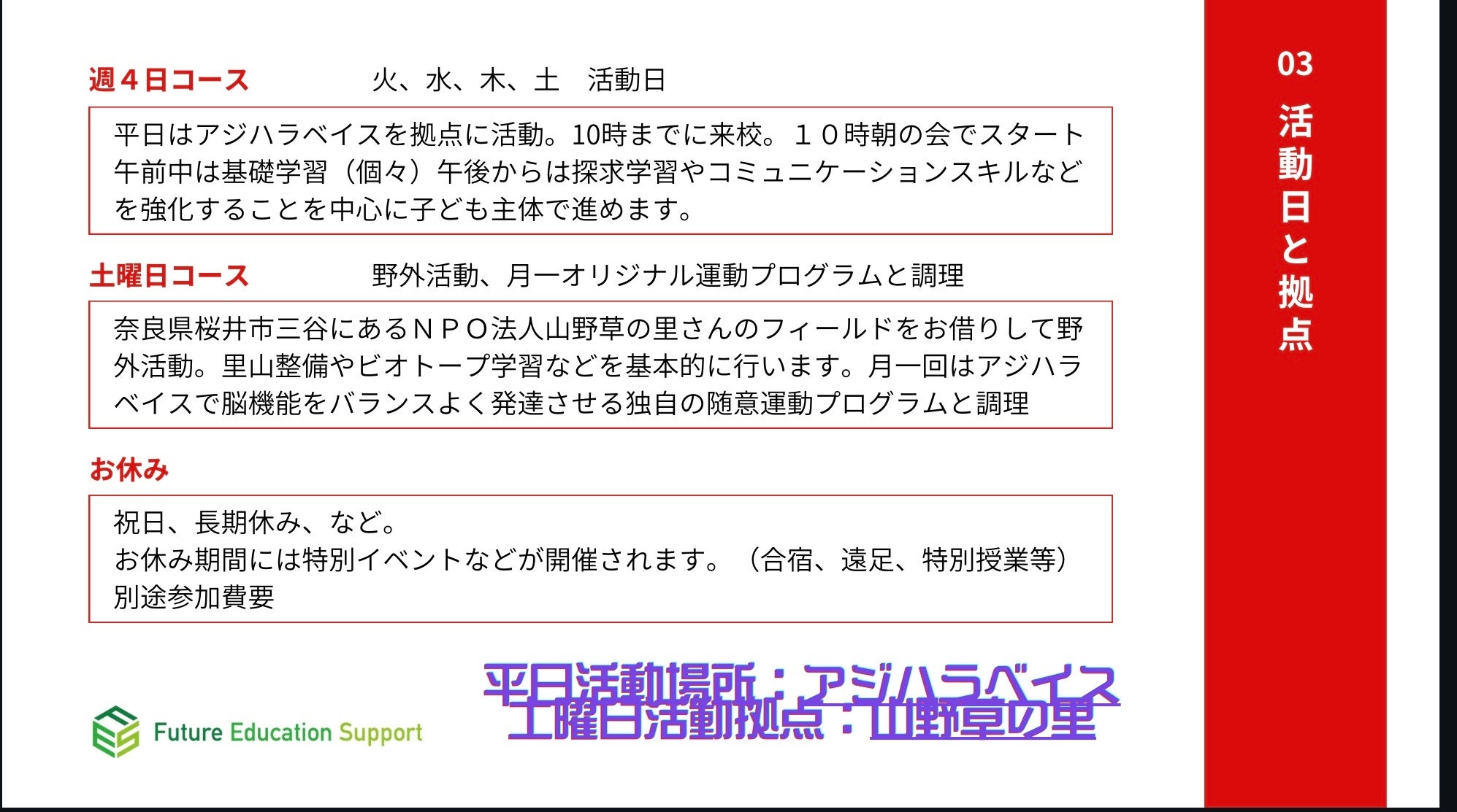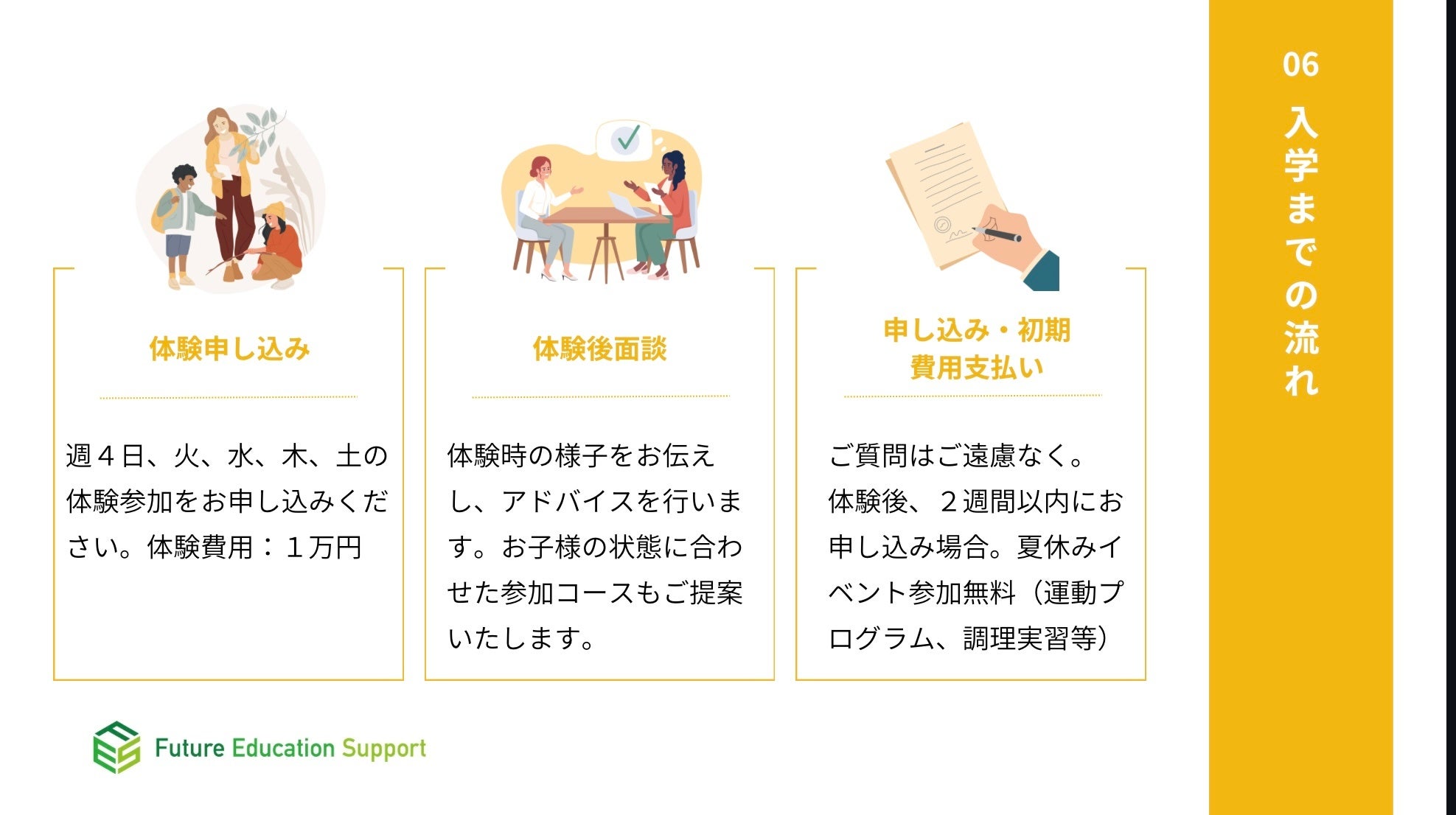 • 体験方法:個別相談/見学/1週間体験(要予約、体験費 1万円)