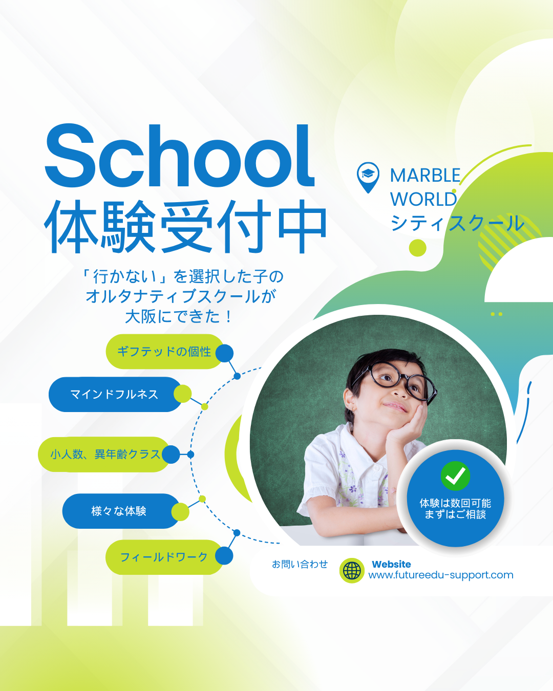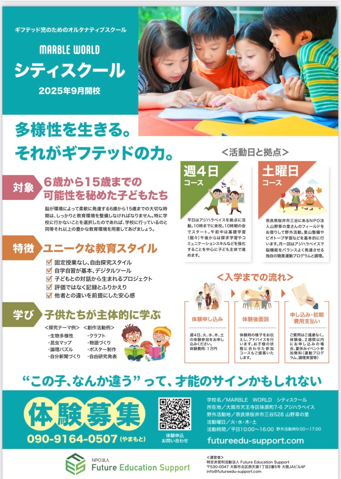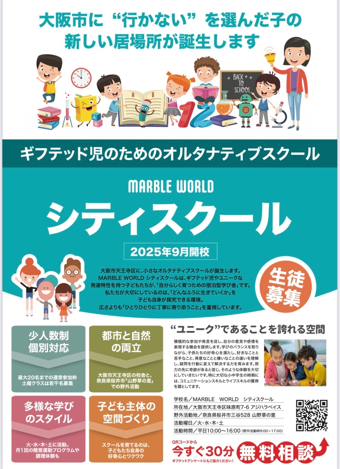 2025年9月、大阪市天王寺区味原7番6号(アジハラベイス内)にて、ギフテッド児を対象とした都市型オルタナティブスクール「MARBLE WORLDシティスクール」が開校しました。