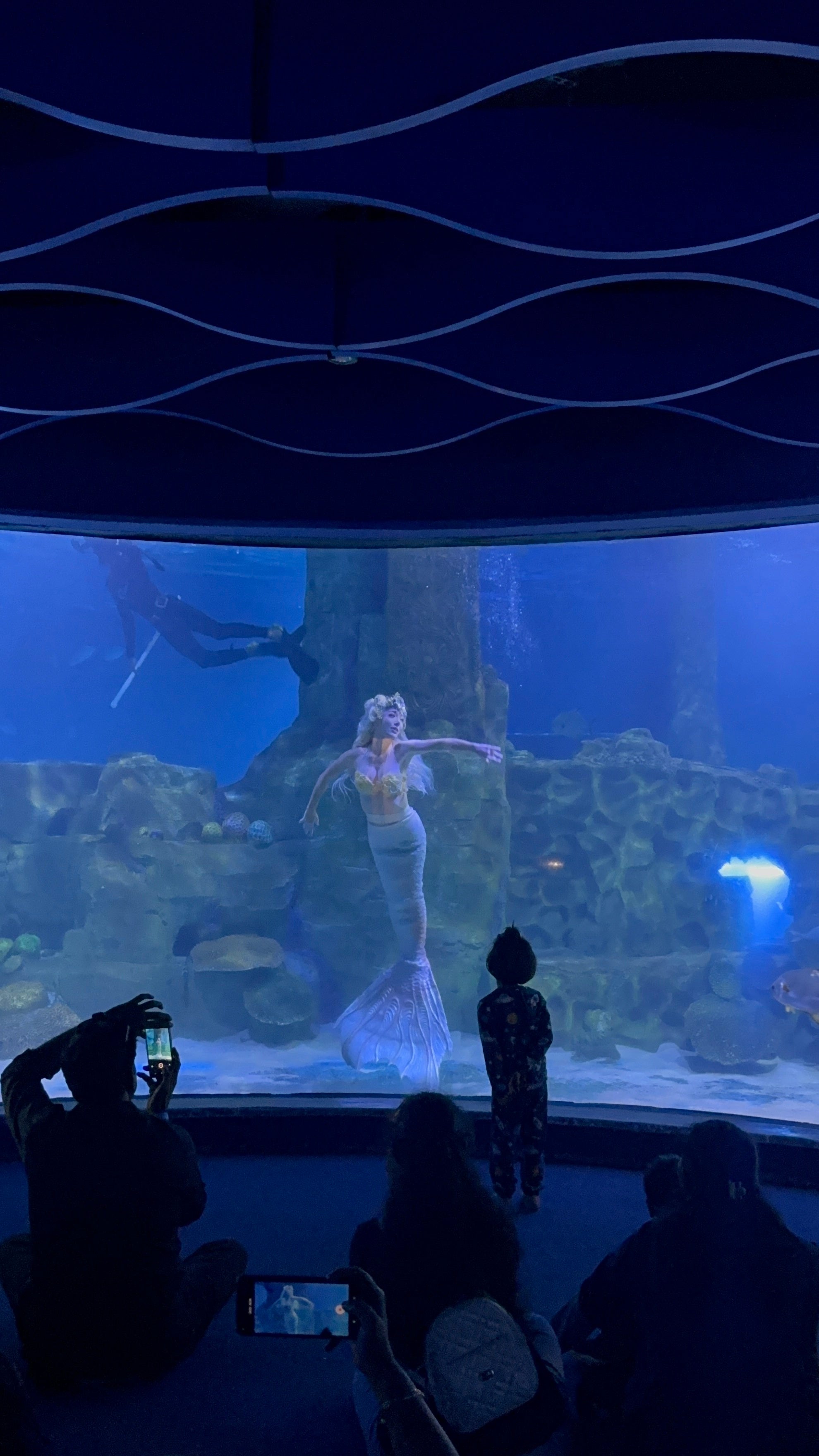 ガラス越しに手を振る子供たち一人ひとりに微笑みかけ、サメやエイといった大型の魚たちと戯れるように泳ぐ姿は、まるで伝説の人魚が現実世界に現れたかのよう。ダイナミックなスピンや、水中で静止する高度な技術を織り交ぜたパフォーマンスは、観客を幻想的な海の世界へと完全に引き込み、大きな歓声と拍手に包まれました。
