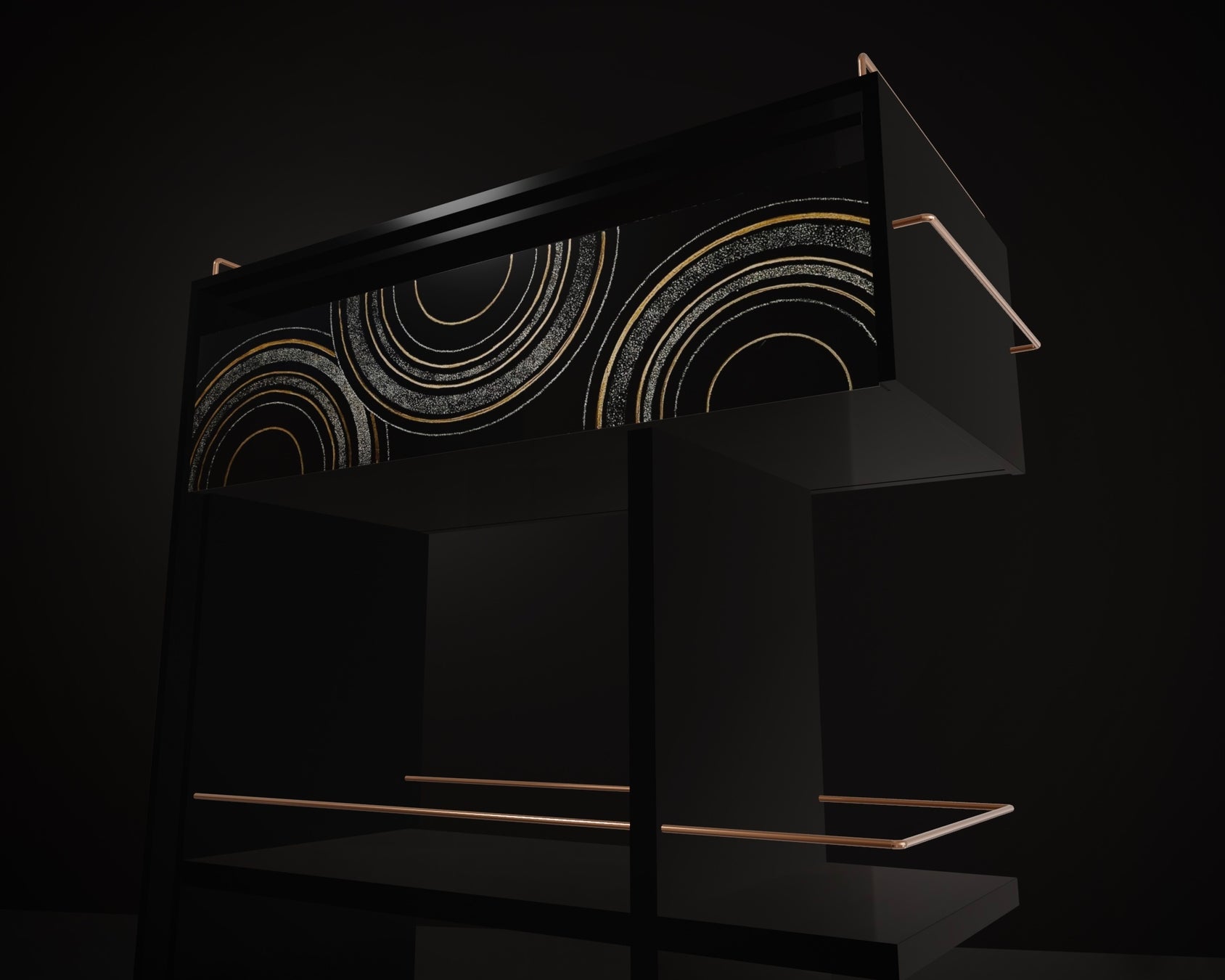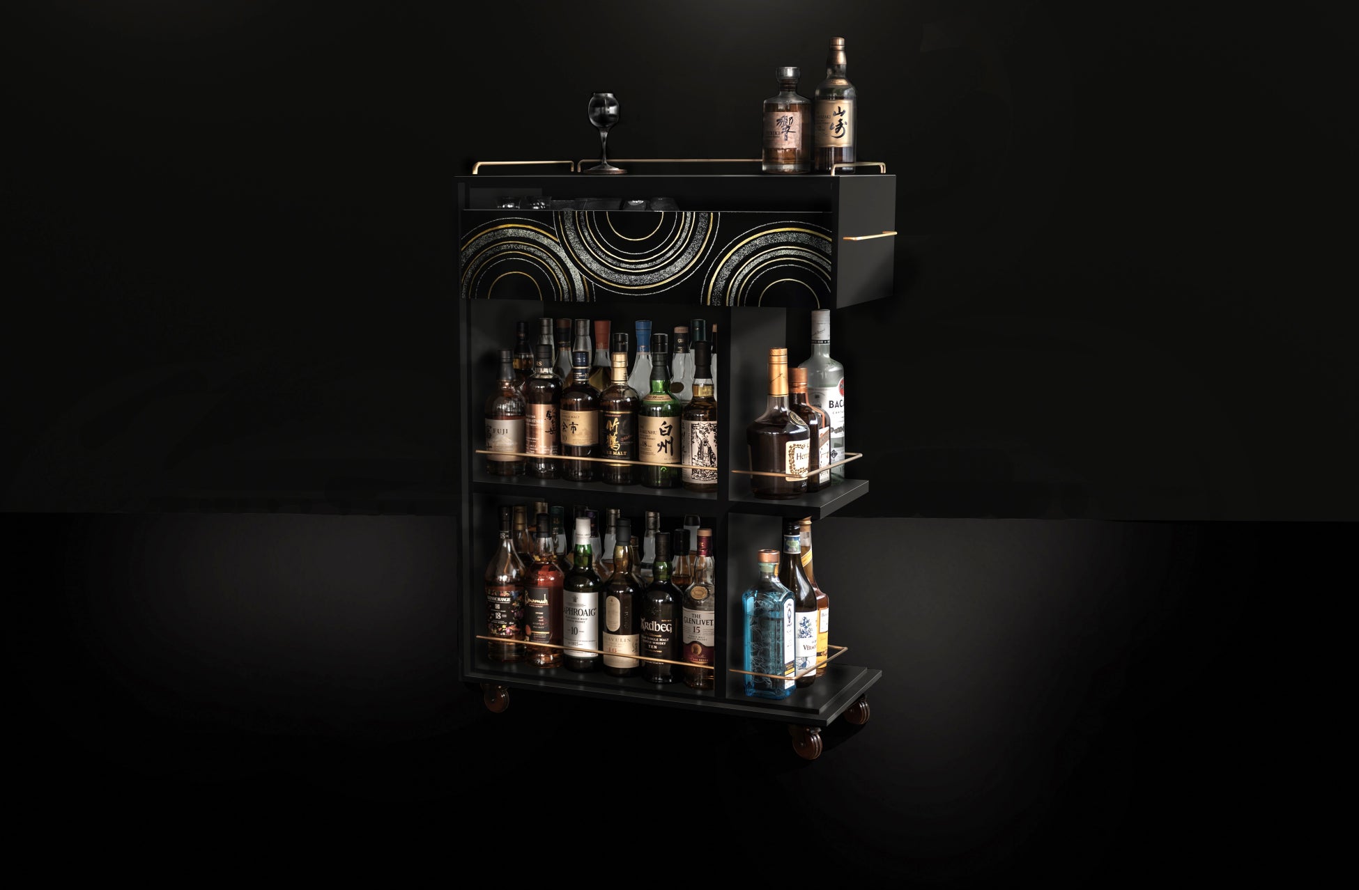 ※上記画像は過去に作製した木製のバーワゴンを黒色とし、 蒔絵のスケッチ画像を基に加工したものです。実際の完成品とは異なる場合がございますのであらかじめご了承ください。