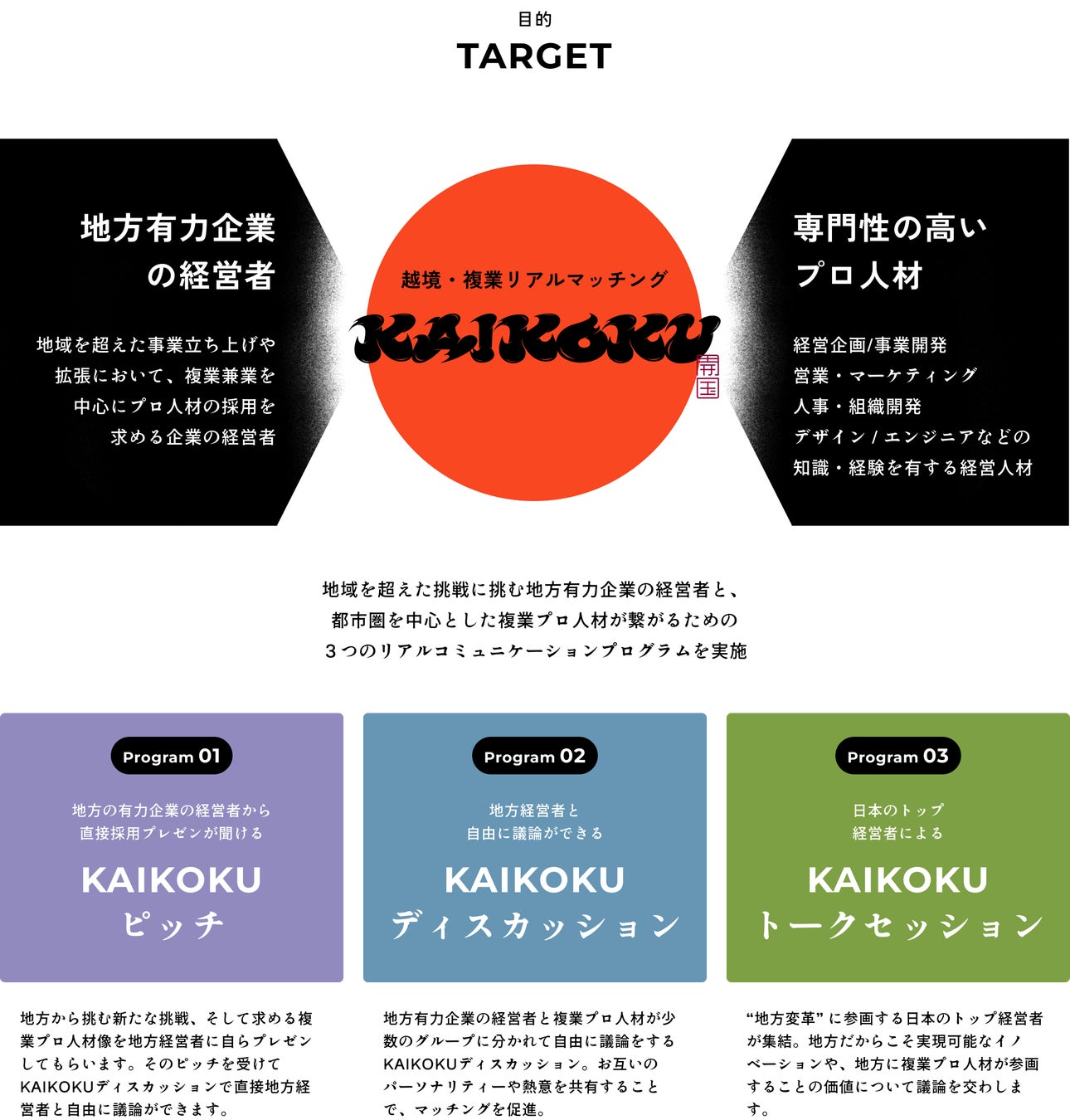 そして、昨年に引き続き、今年もこの流れをさらに加速させるため、「KAIKOKU 2024」を開催いたします。このイベントを通じて、地方企業が抱える人材不足の課題を解決し、地方企業と都市部の専門性の高いプロ人材が繋がり、新たな価値を共創する場を創出します。そしてこの先、日本のポテンシャルを最大限発揮できる地方企業が、地方から社会へ、地方から世界へ挑戦できる未来を目指していきます。