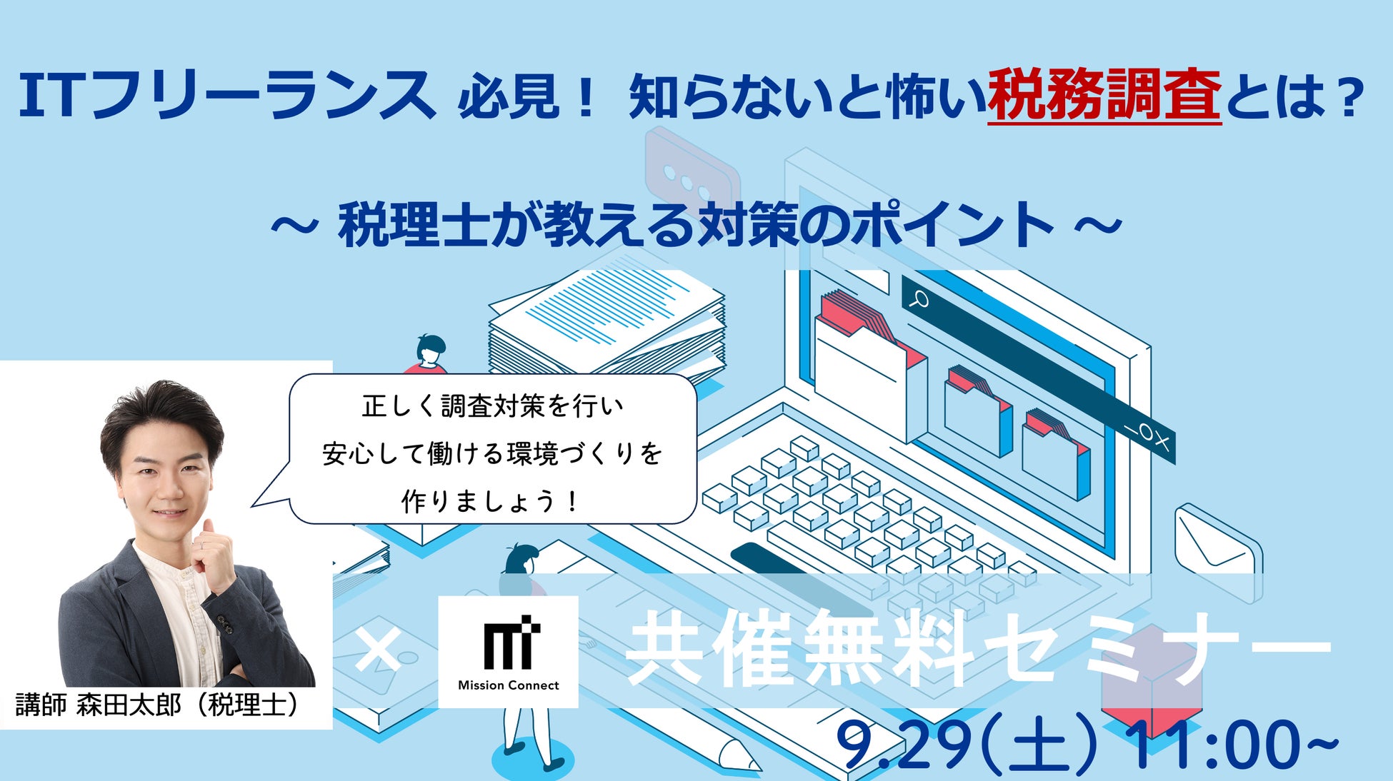 株式会社ミッションコネクト(本社:東京都品川区、代表取締役:太田光一、以下「ミッションコネクト」)は森田税理士(本社:東京都新宿、森田太郎税理士事務所代表)と共催で、9月29日(土)11時より無料オンラインセミナー【タイトル:ITフリーランス必見!知らないと怖い税務調査とは?】を開催いたします。