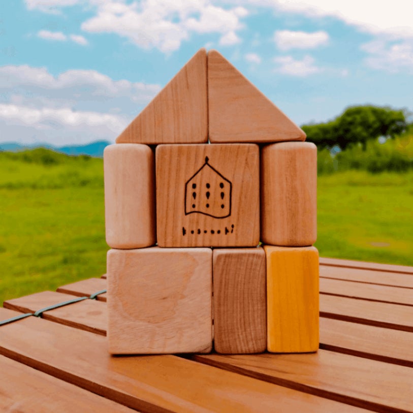 有限会社一場木工所(本社:広島県三次市)とコラボして製作しました。広島で大切に育てられたヤマザクラやクスノキを使用した、優しい手触りの積み木セットです。自然の木目と温もりを活かした素材選びで肌に優しく、想像力を育む遊び道具として、お子さんの成長と共に長く愛用いただけます。お誕生日や出産のお祝いギフトにもぴったりです。