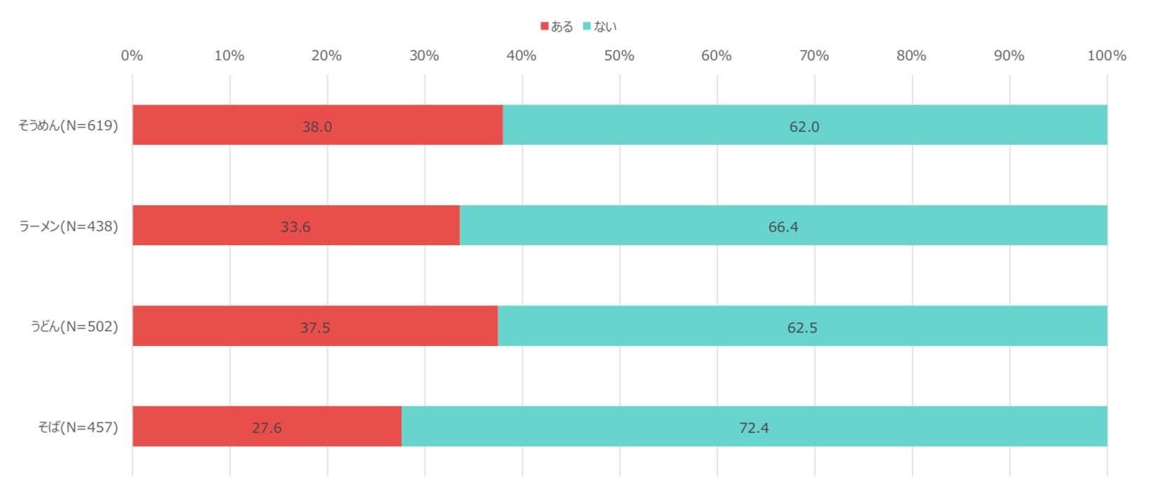 そうめんをアレンジ調理したことがある:38 % 、そばよりもアレンジ調理経験が高い麺種