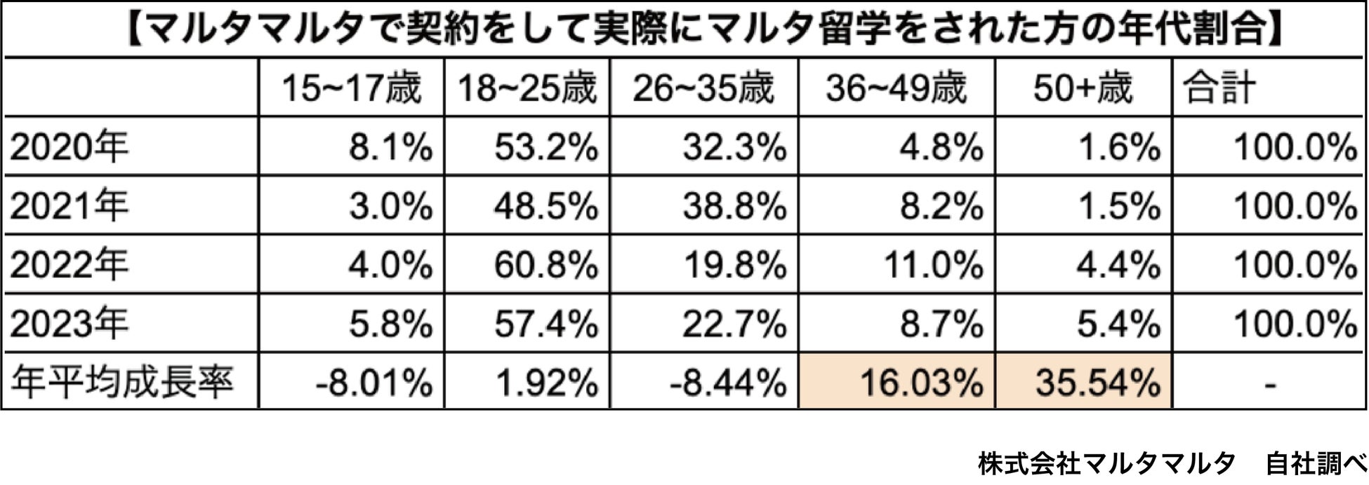 マルタマルタで契約した留学生を年代別で確認すると、2020年から2023年までの4年間で、36歳〜49歳の割合、50歳以上の割合において、年平均成長率がそれぞれ16.03%、35,54%と高いことが分かりました。徐々に社会人の中でも高い年齢層がマルタ留学を行っていることが分かります。