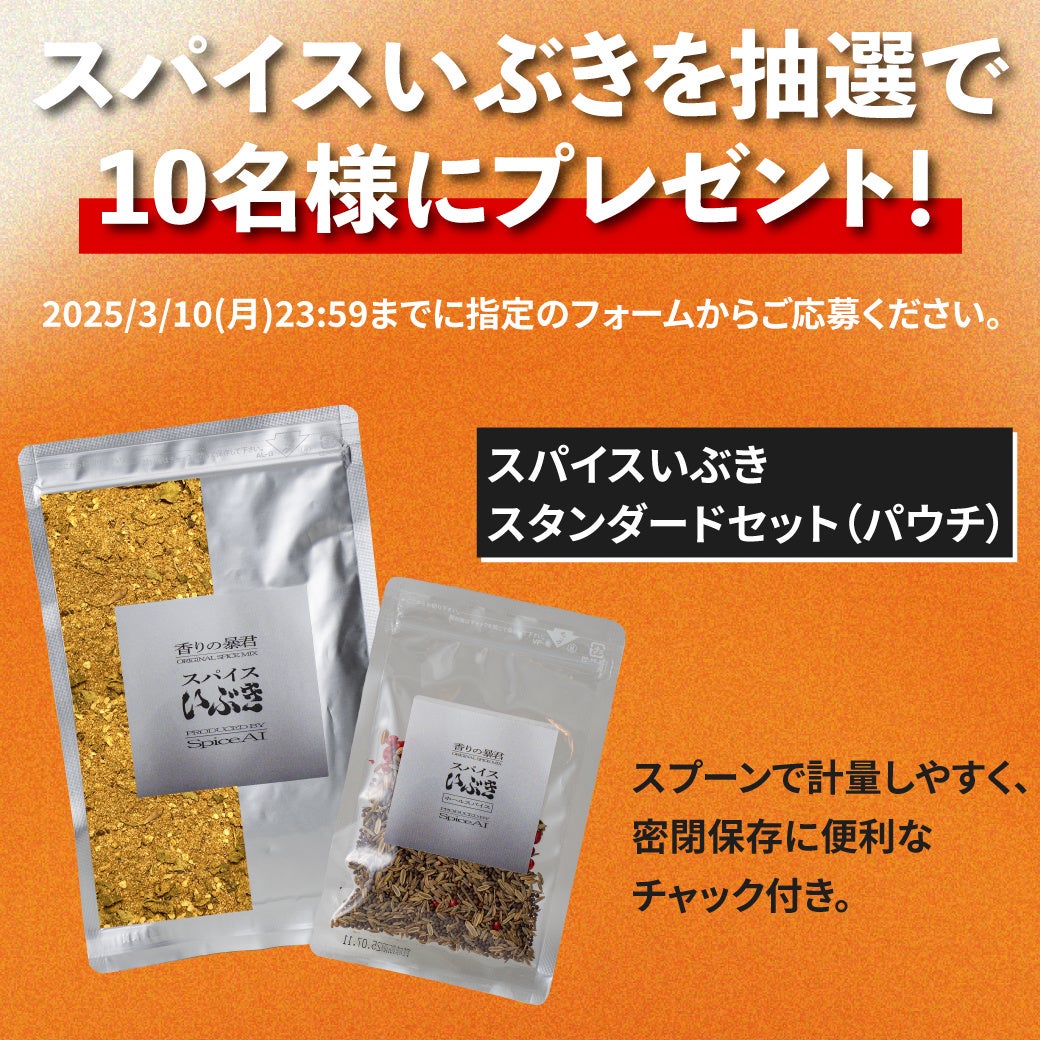 2025年3月10日 (月)までに指定のフォームよりご応募いただいた方から抽選で10名様に、スパイスいぶき スタンダードセット(パウチ)をプレゼントいたします。