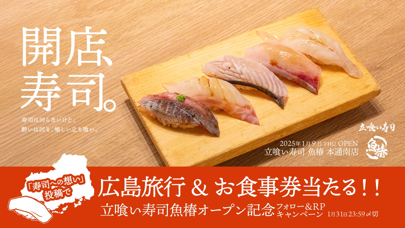 【立喰い寿司「魚椿」】広島での新店舗オープンを記念して、「寿司への想い」投稿で、広島旅行が当たるSNSキャンペーンを開催。