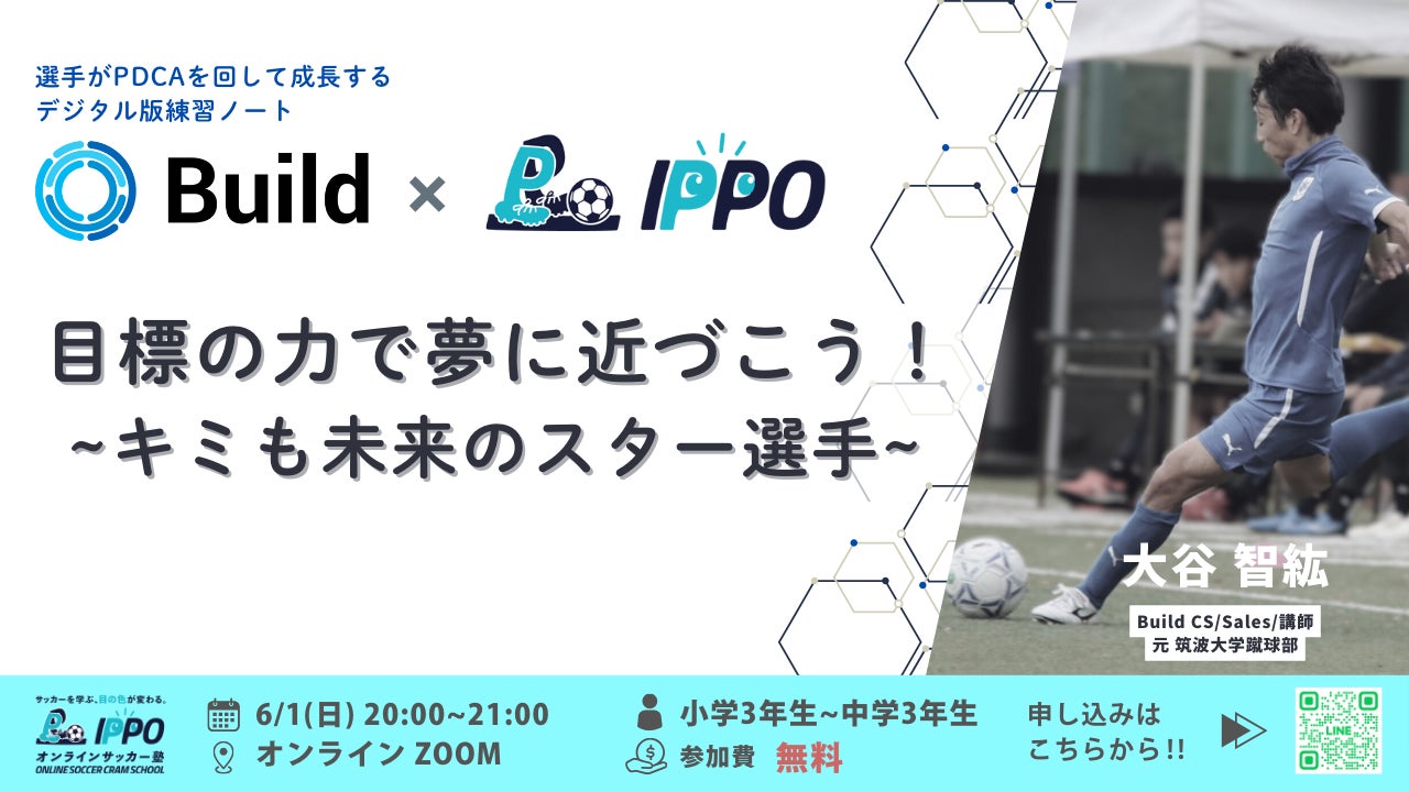 本提携により、オンラインサッカー塾IPPOの塾生を対象に、目標設定と振り返りを日常的に行うことができるツール「Build」の提供を開始します。「Build」は、選手自身が自分の目標を言語化し、日々の取り組みを振り返りながら改善へとつなげるデジタル版練習ノートです。
