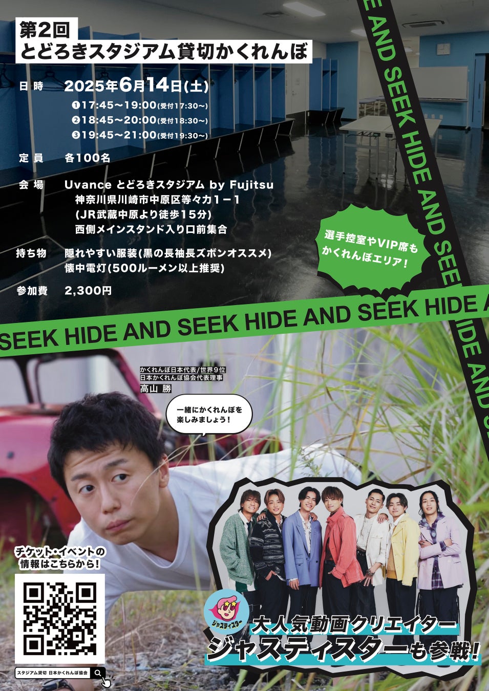 「本気で遊ぶ大人をふやす」ことを目的とし、一般社団法人日本かくれんぼ協会(本部:東京都渋谷区 代表者:高山 勝)はUvance とどろきスタジアム by Fujitsuにて定員に300人でのかくれんぼ大会を開催。ゲストには動画クリエイターのジャスティスターが参加。