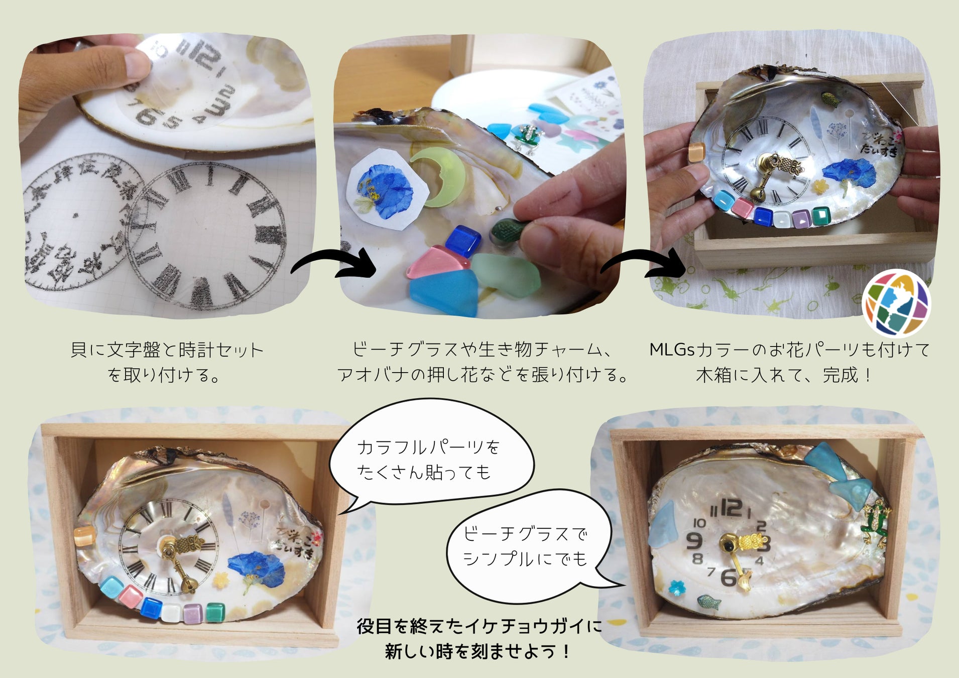 内容:役目を終えたイケチョウガイに文字盤と時計セットを取り付け、貝にビーチグラスや生き物チャーム、アオバナの押し花などを貼り付けます。あなたの叶えたいMLGsカラーのお花パーツも付けて木箱に入れて、時計ボックスの完成です。サイズは 横17cm×高さ13cm×奥行6cm、壁にかけるフック付き。