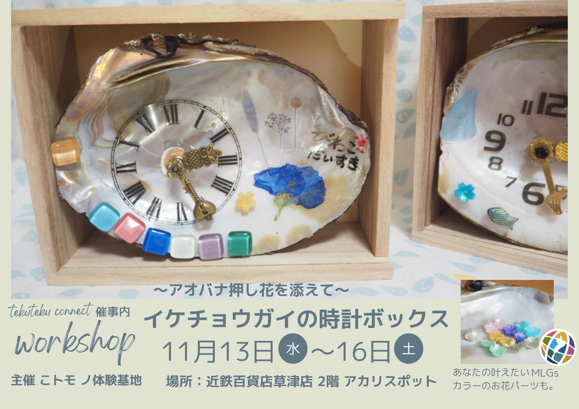 この度、近鉄百貨店草津店 催事内にて こトモノ体験基地主催のワークショップを4日間開催致します。役目を終えた貝に飾りつけを行い新しい時を刻む時計ボックスの制作ができます。琵琶パールが生み出されるまでの生産者とイケチョウガイの年月や琵琶湖のある暮らしを学び、感じたことをあなただけのイケチョウガイの時計ボックスとして、またビーチグラスや生き物チャームなどを飾りつけることができます。草津の市の花であり、同じく地域資源として古くからこれからも活用されるアオバナの押し花も添えます。あなたの叶えたいMLGsカラーのお花パーツを付けて完成! 初めて行うワークショップですので、この機会にお楽しみください。展示物の見学だけでも歓迎です。