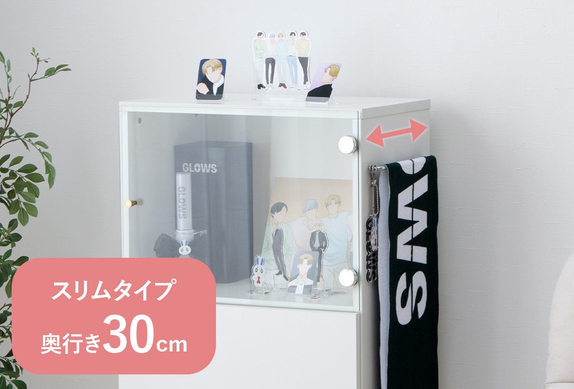強化ガラス部分は、埃を被らずにグッズを美しくディスプレイいただけます。また、高さ30cmのペンライト箱も収納可能で、大切なアイテムをしっかりと保護いたします。