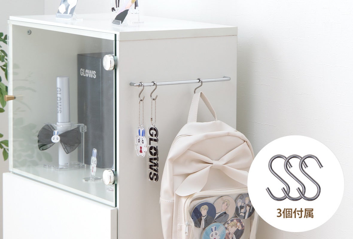 ワイドタイプの左扉内側には、2段階の高さ調整が可能なバー付き収納スペースがあり、横幅30cmのうちわや雑誌、ファイルなどをすっきりと収納していただけます。また、付属のS字フックをバーに掛けてキーホルダーも飾っていただけます。