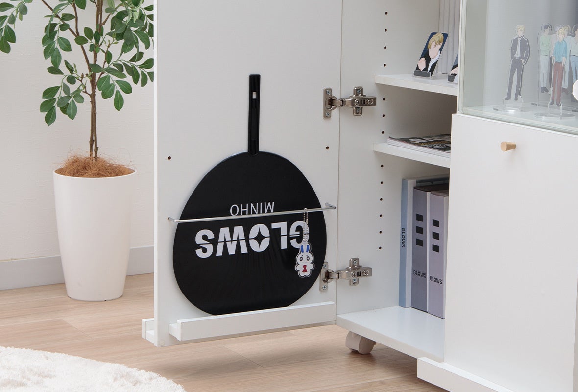 横幅30cmのうちわや雑誌がすっきりと収まるスペースがあり、グッズを集めるのが好きな方に最適でございます。