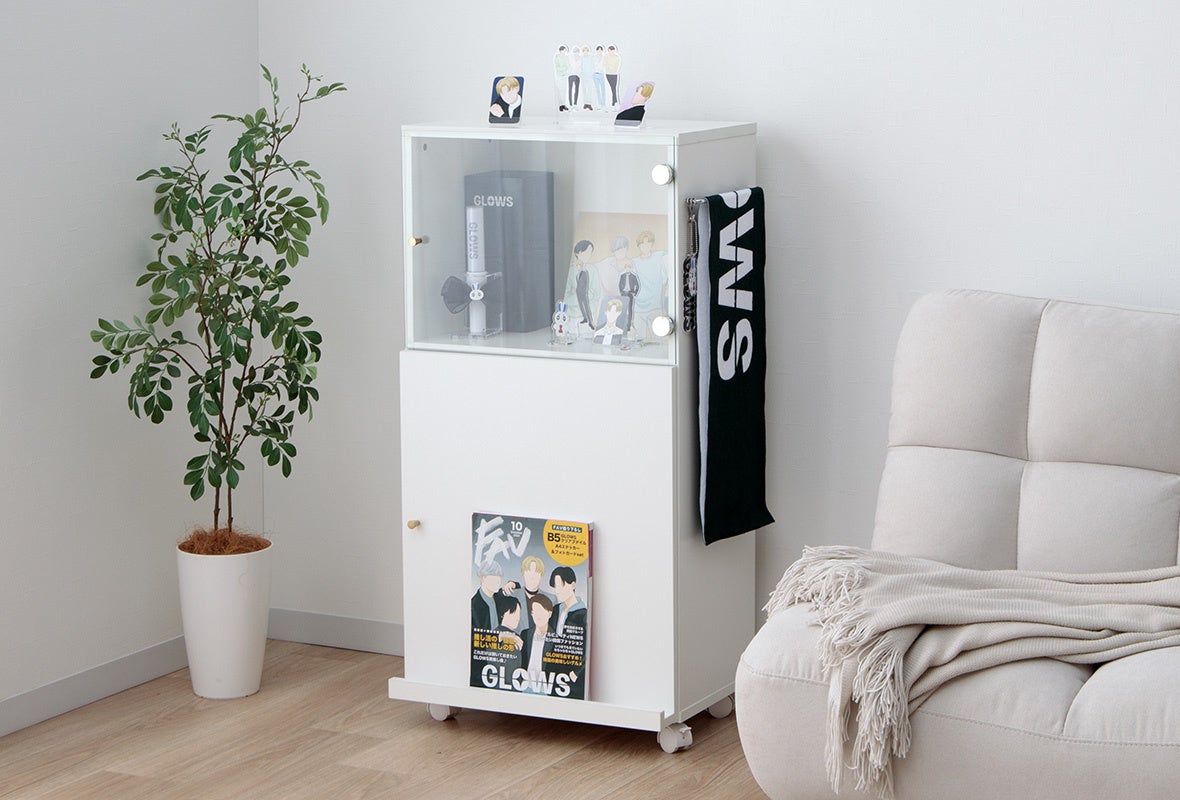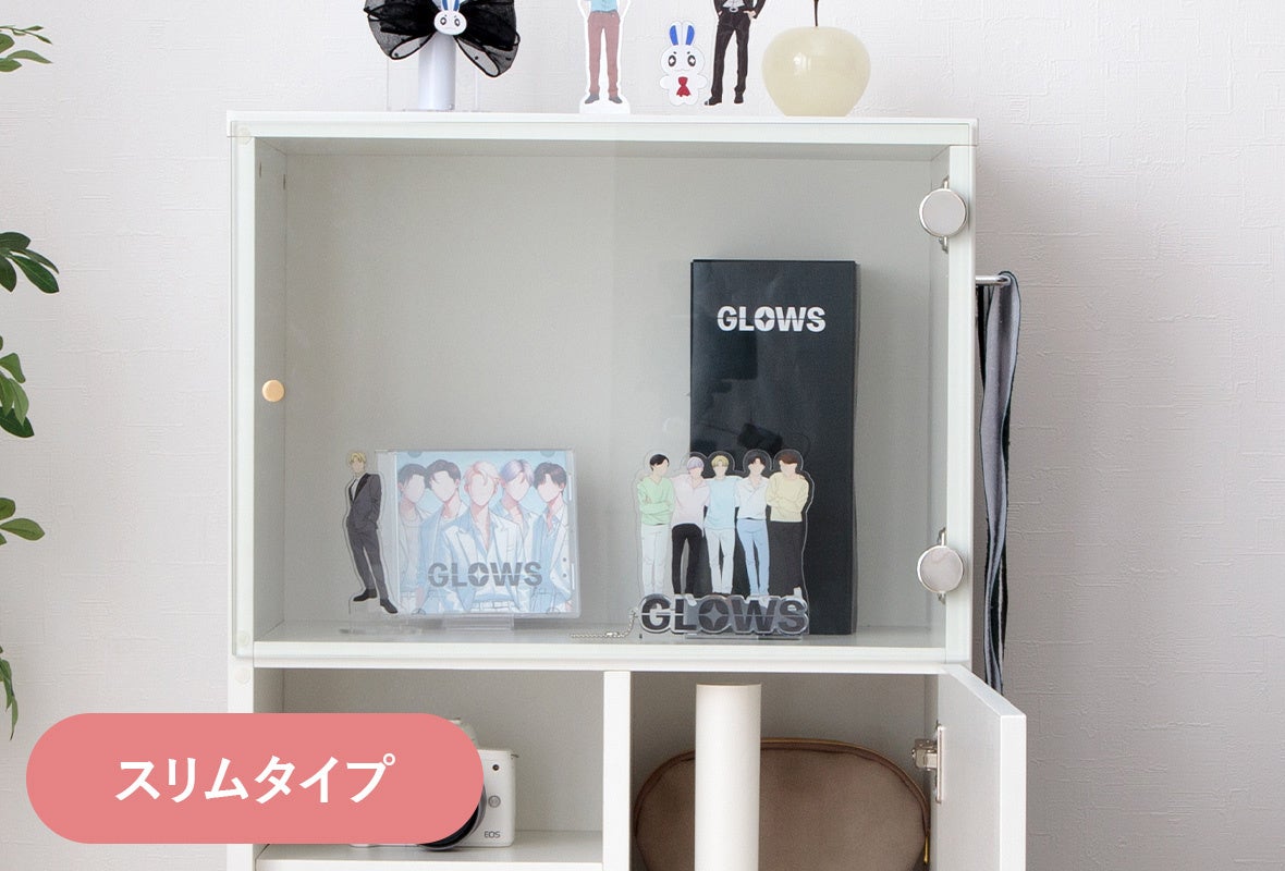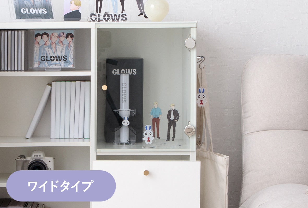 ガラス扉のディスプレイスペースが広めに設計されているため、埃を防ぎながらグッズをたっぷりと飾っていただけます。