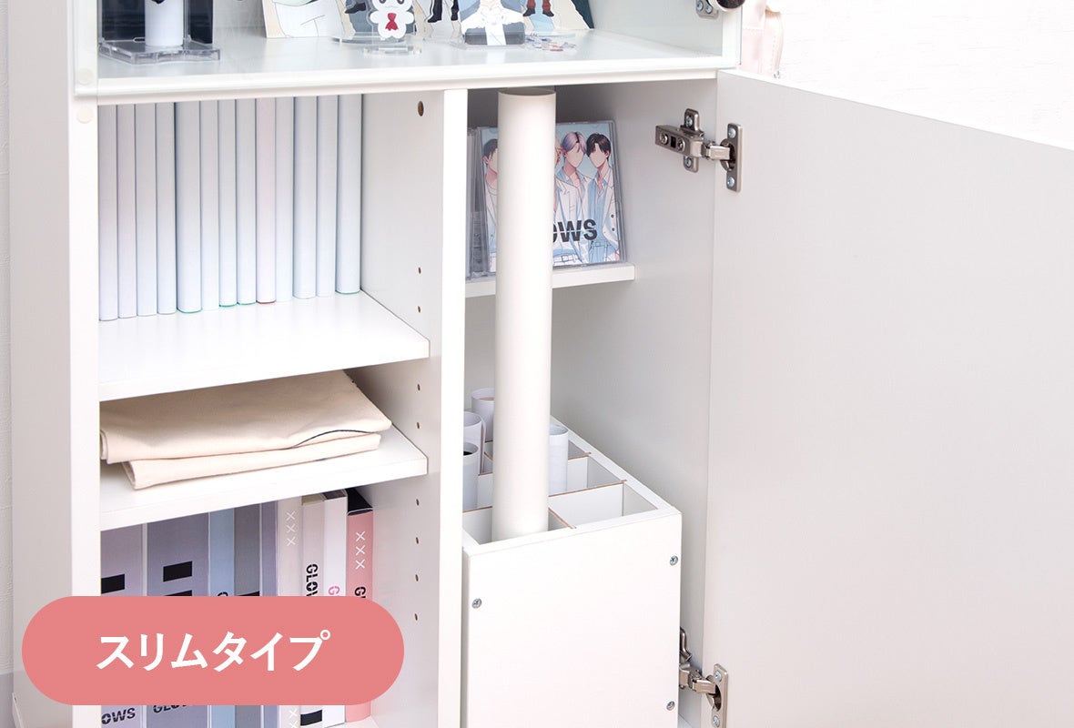 ポスターやスローガン、アルバムも収納でき、スリムタイプではポスター大サイズ(51×72cm)も収納していただけます。ポスター収納部分は間仕切り板を取り外せるため、他のグッズも収納でき、非常に便利にお使いいただけます。