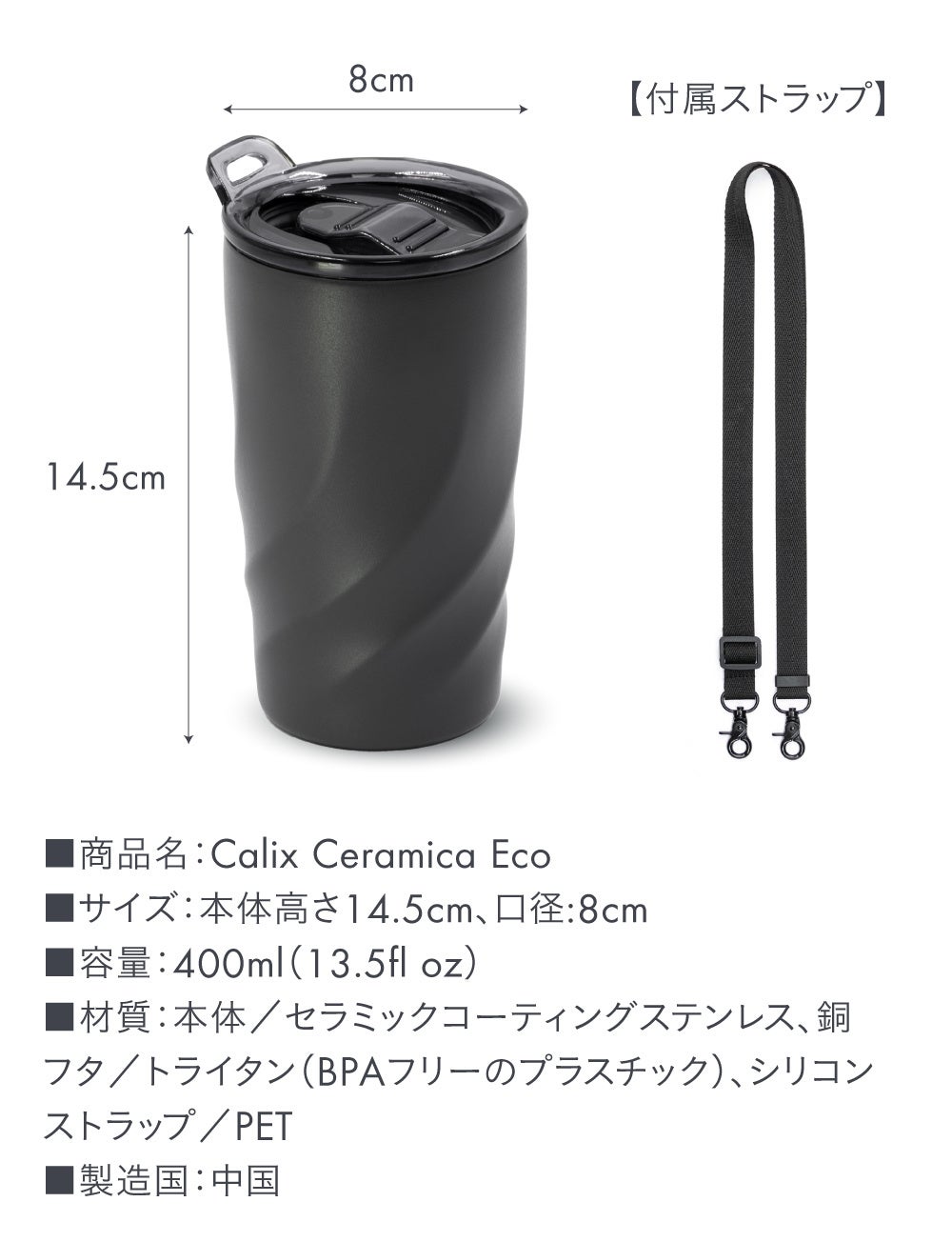 現在において仕事の小休憩やカフェでのリラックスタイム等、様々な場面で登場するタンブラー。「Calix Ceramica Eco」は、これまで主流であったステンレス製独特の金属臭や色うつりといったウィークポイントを解消した、新感覚のストラップ付き真空断熱タンブラーです。