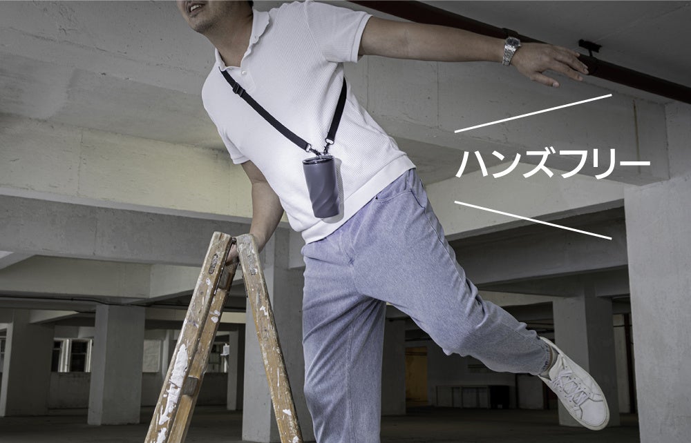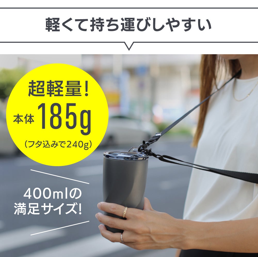 また、本体185g(フタ込みで240g)という軽さと、ねじ込み式で密閉性の高い蓋を採用することで漏れの心配なくカバン等に入れることが出来るため、携帯性にも優れ、付属の長さ調節が出来るストラップを装着することでハンズフリーとなり、作業中も好きな時に飲み物を飲むことが出来ます。
