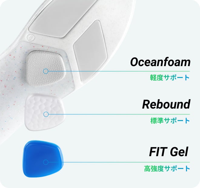 足の中央部分に3つ、かかと部分に4つのパッドを取り付けられ、それぞれ異なる弾力性や硬さを持っているので、自分の用途や足にピッタリ合った使い方ができます!