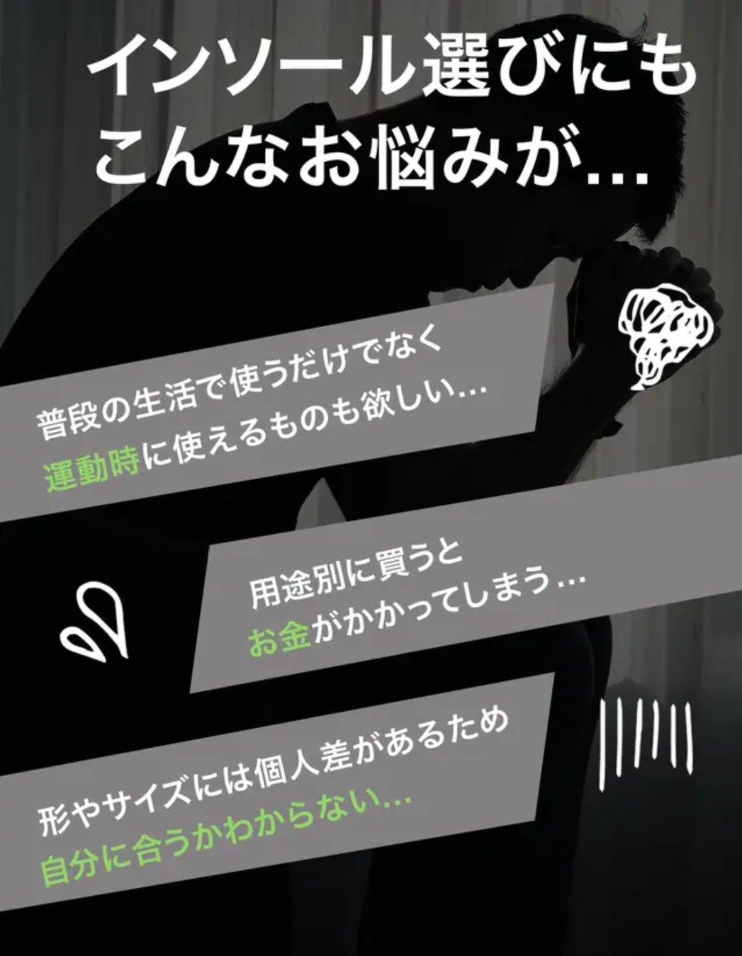 1つのインソールで、個々の使用方法や足の形状に合わせるのは難しく、どれを選べばいいのか迷うという課題がありました。