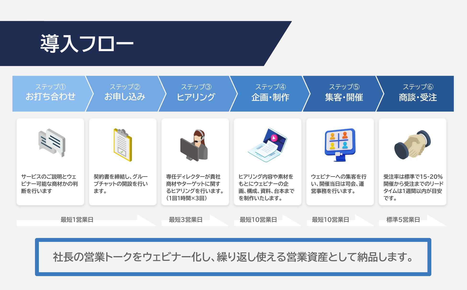 「セミナーBPO」では、1回1時間のヒアリングを計3回実施していただくだけで、ウェビナー開催に至るすべての工程を代行いたします。初回ヒアリングから開催までの期間は、最短で約1ヶ月半、受注に至るまでの期間は、概ね2ヶ月を想定しています。
