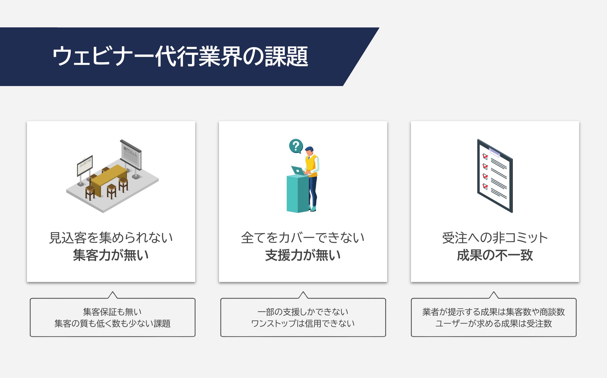 集客力のない体制、アドバイスのみに留まる「ワンストップ支援」体制、受注数への非コミット、わかりにくい料金体系など、ウェビナー代行業界の課題を解消するサービスを再リリースしました。