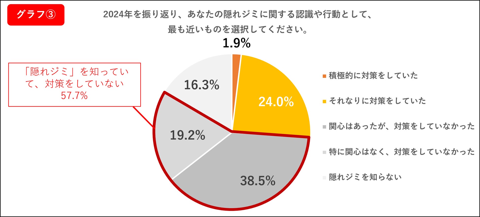 「隠れジミ」を知っている人は83.6%と多いものの、対策までよく知っている人は1%と少ない結果となりました。(グラフ②)更に、対策について調査をしたところ、「隠れジミ」を知りながら対策していない人は57.7%という結果になりました。(グラフ③)「隠れジミ」の認知度は比較的高いが、自分ゴト化できておらず、ケアの優先度が低くなっていることが推測されます。