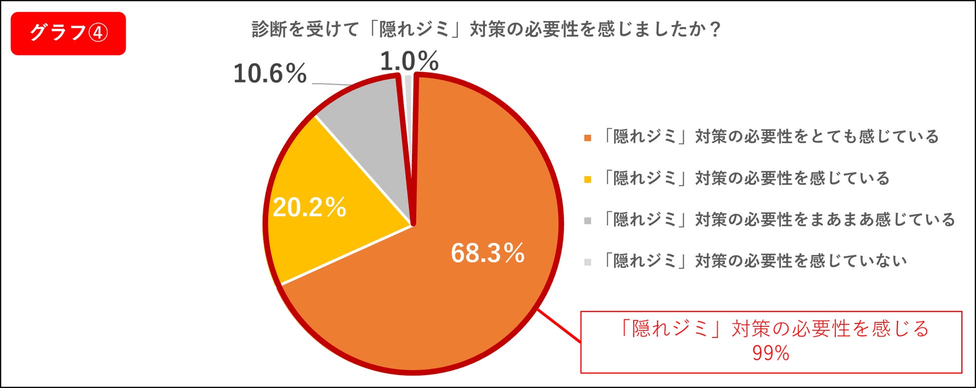 「隠れジミ」を対策している人の割合は25.9%であった(グラフ③)一方で、肌診断後には99%が「隠れジミ」への対策の必要性を感じると回答しました。(グラフ④)肌診断機器VISIAで自身の「隠れジミ」を可視化したことで、自分の肌を知るきっかけになったと考えられます。