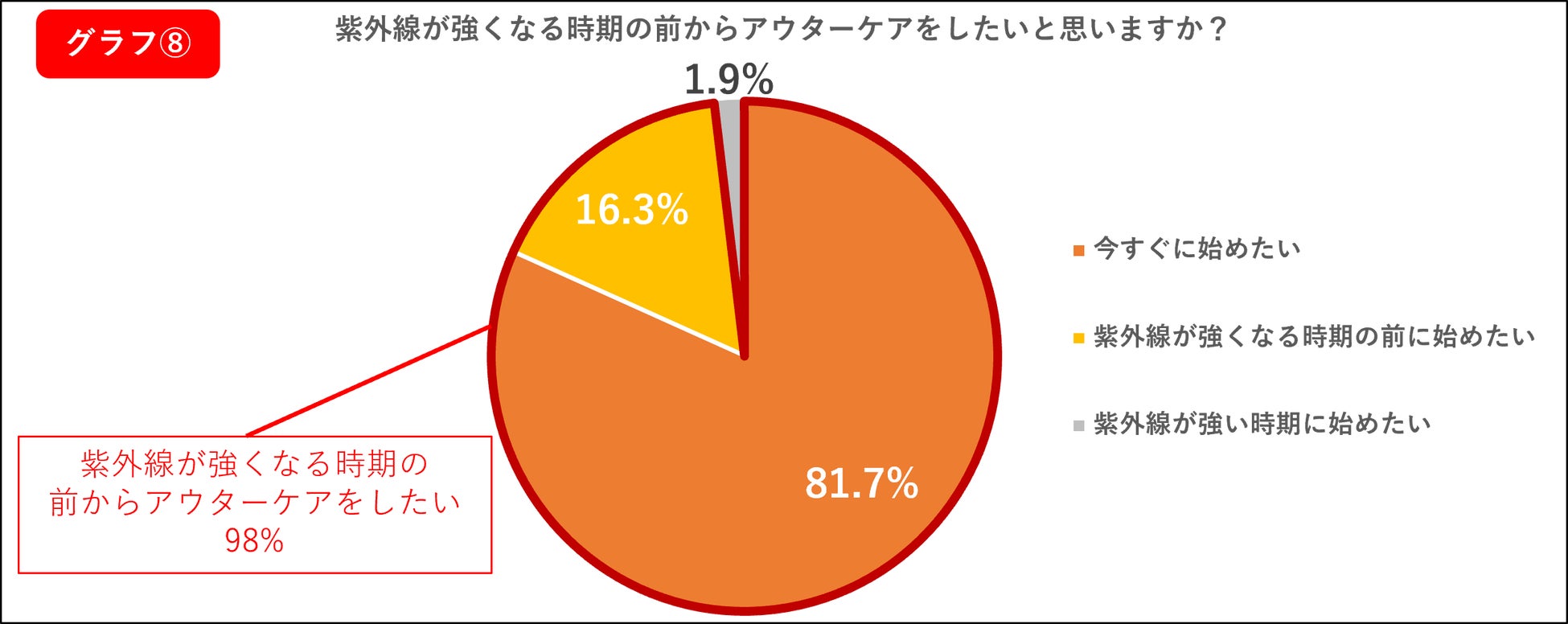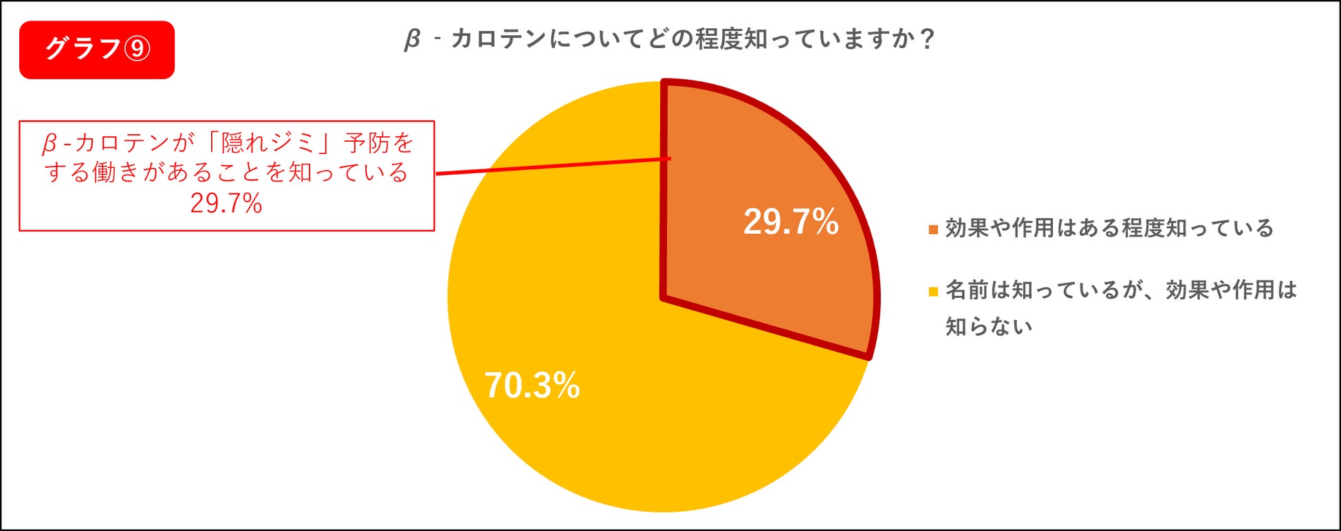 肌診断後に、『「隠れジミ」対策はいつから始めたいですか?』と聞いたところ、94.2%がインナーケアを(グラフ⑦)、98%がアウターケアを(グラフ⑧)紫外線が強くなる時期の前から始めたいと回答しました。また、にんじんなどに含まれるβ-カロテンが「隠れジミ」予防をする働きがあることを知っていたのは全体の29.7%となり、まだまだ知られていないことが判明しました。(グラフ⑨)