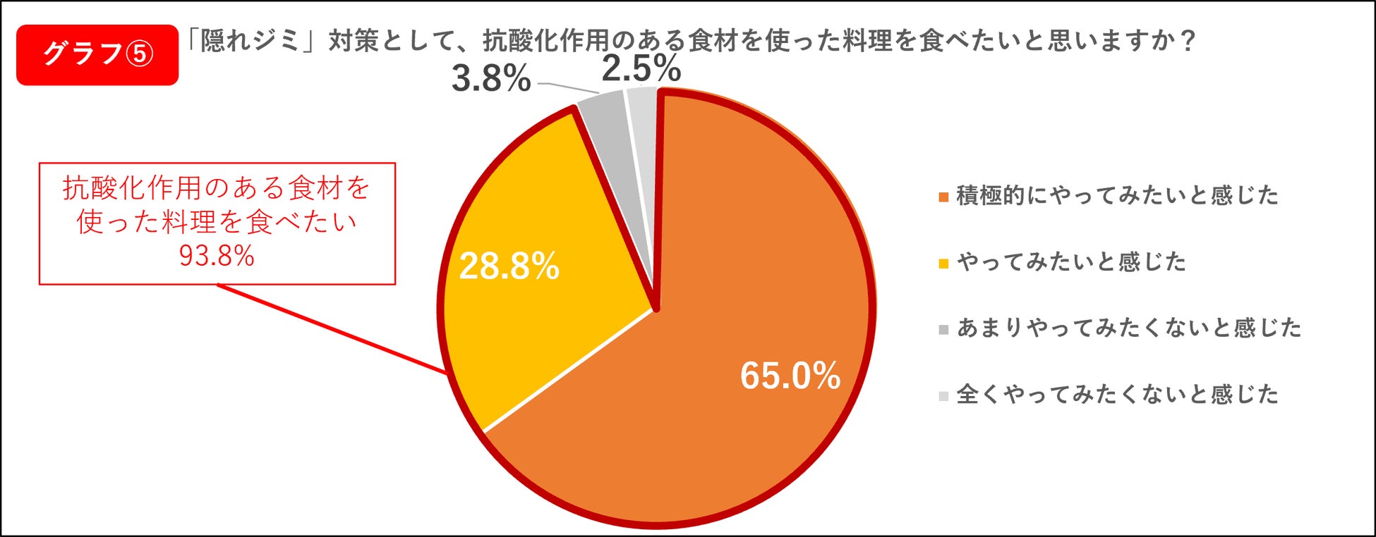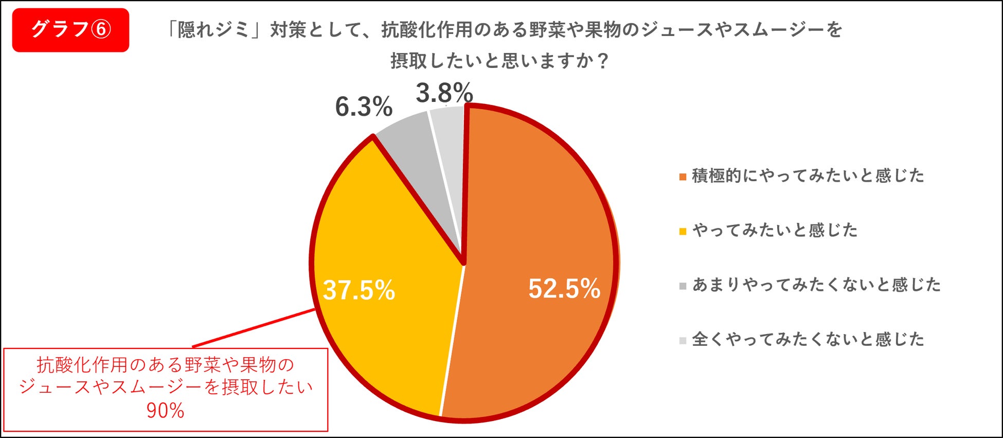 また、やってみたい「隠れジミ」対策として、『抗酸化作用のある食材を使った料理を食べる』と答えた人が93.8%、(グラフ⑤)『抗酸化作用のある野菜や果物のジュースやスムージーを摂取する』と答えた方が90%という結果となりました。(グラフ⑥)
