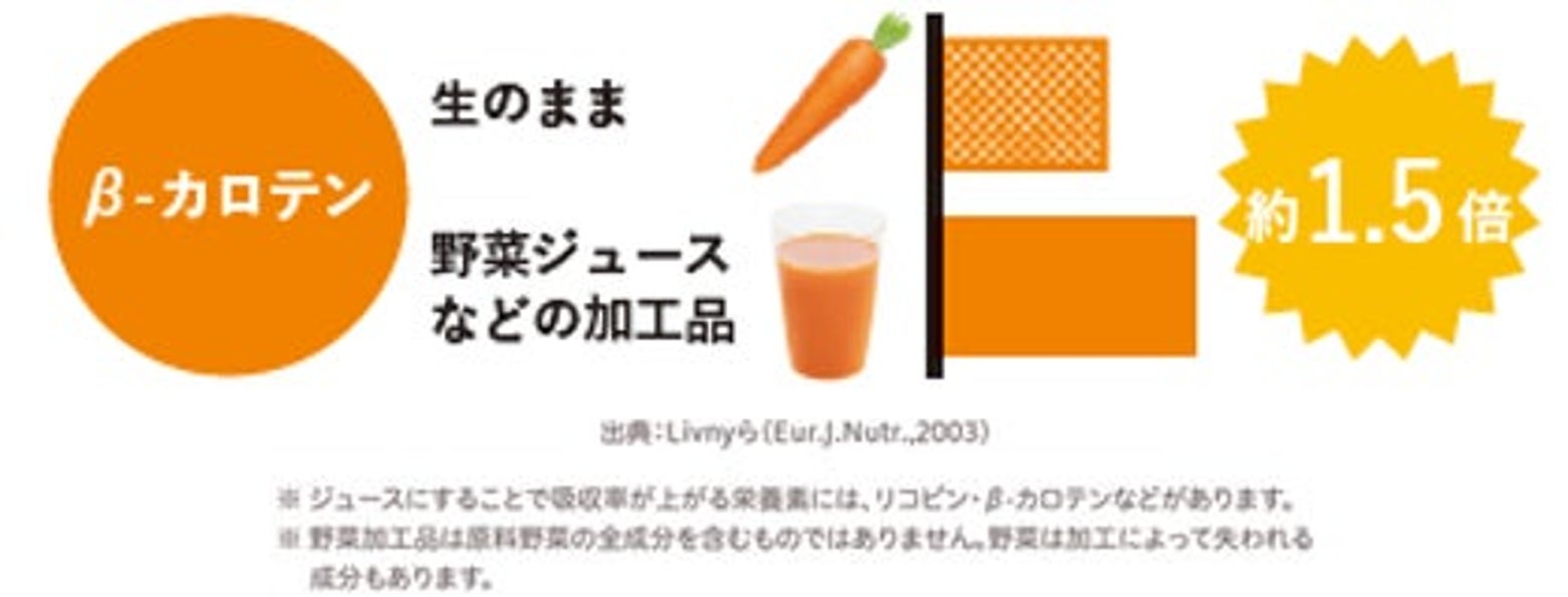生野菜と比べると加工した野菜は栄養成分が減少してしまうというイメージが強いですが、β-カロテン成分は野菜ジュースにすることで逆に吸収率が高まる栄養素であることがわかっています。