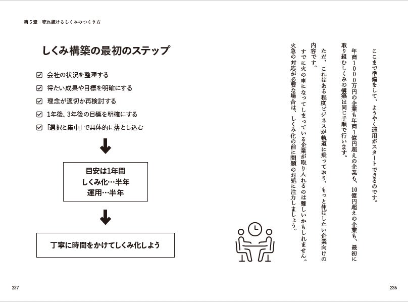 本書で紹介している内容は、短期間で売上を上げて終わりではなく、長く安定して売上を維持し続けるための「経営のしくみ化」です。