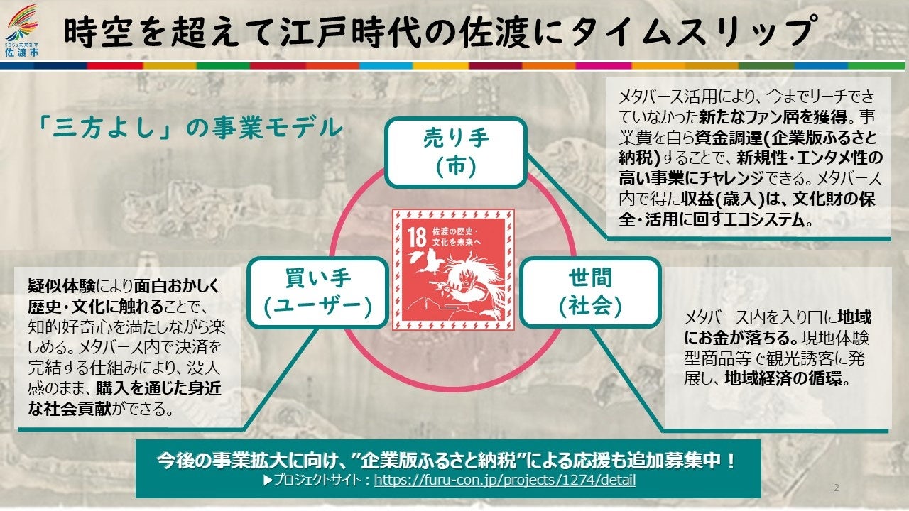 メタバースを通じて、ユーザー、地域、社会の三者が互いに利益を享受し、新たな佐渡ファンや地域への人の流れの創出、文化の活用・継承を目指しています。この仕組みは、循環型事業モデルで文化を未来へ繋ぐことを目指しています。